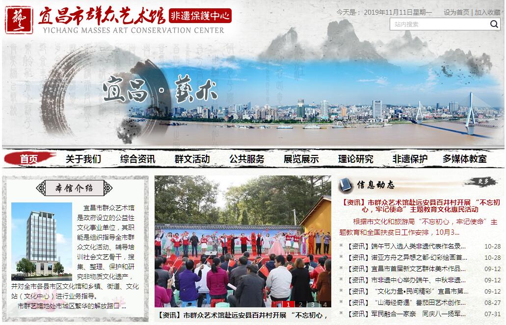 宜昌市群众艺术馆前身是宜昌市人民教育馆,成立于1949年10月17日。后几经变迁,随着宜昌地、市合并,1992年5月,原市群众艺术馆、原宜昌地区群众艺术馆合并为“宜昌市群众艺术馆”,2008年6月,市编办下发文件(宜编办[2008]14号),同意在市群众艺术馆增挂“宜昌市非物质文化遗产保护中心”牌子。实行一套班子二块牌子。宜昌市群众艺术馆是政府设立的公益性文化事业单位,其职能是组织指导全市群众文化活动、辅导培训社会文艺骨干,搜集、整理、保护和研究非物质文化遗产,并对全市各县市区文化馆和乡镇、街道、文化站(文化中心)进行业务指导。市群艺馆内设机构有馆办公室、文艺活动部、培训辅导部、调研部、美术摄影部、展览部、非物质文化遗产保护中心办公室等7个部室。现有在编职工40人,具有专业技术职称的34人,其中高级职称13人,中级职称17人。市群艺馆地处市城区繁华的解放路口,建筑面积7000平方米,有演艺厅、排练厅、展览厅、多功能厅、画室、琴房、合唱厅、文艺培训厅、非物质文化展示厅、非遗传承室等活动场所。建有流动舞台1个,舞台灯光、音响齐全。近几年来,由于各项工作成绩显著,宜昌市群众艺术馆先后被授于“第二届全国特色广场文化活动先进单位”、“全国文化进社区活动先进单位”、“第八届中国艺术节筹办工作先进单位”、“宜昌市创全国群众文化精品先进单位”、“第八届中国艺术节宜昌分会场筹办工作先进单位”。2009年,被国家人力资源和社会保障部、文化部授予“全国文化系统先进集体”称号。2011年,该馆被文化部正式授予“国家一级馆”称号。市群艺馆常年对社会服务的项目有:音乐、舞蹈、器乐、美术、书法、摄影、非物质文化遗产等方面的培训、讲座、展览展示、开展公益性广场群众文化活动、培训辅导各类群众性业余文艺团队等。随着市群艺馆新馆的开馆,将为宜昌全面提升公共文化服务水平,进一步发挥公共文化机构的职能,更好地保障人民群众的基本文化权益,满足广大群众的精神文化需求,为服务宜昌经济社会发展作出新的更大的贡献!
