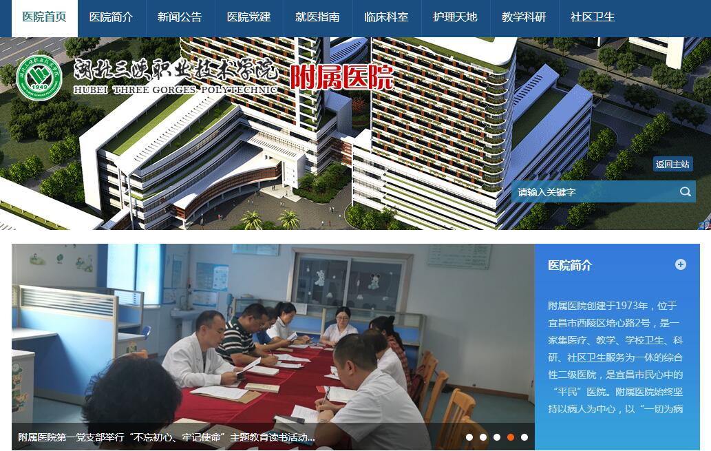 湖北三峡职业技术学院附属医院创建于1973年,位于宜昌市西陵区培心路2号,是一家集医疗、教学、学校卫生、科研、社区卫生服务为一体的综合性二级医院,是宜昌市民心中的“平民”医院。附属医院始终坚持以病人为中心,以“一切为病人服务、一切让病人满意”为宗旨,充分发挥名老中医、内科、康复科、口腔科等特色科室专长,为患者提供了高质量的医疗服务。附属医院内科有临床经验较为丰富的“神经内科、心血管内科、消化内科”高年资医师,对消化系统疾病、心血管疾病的诊治提供了可靠保证;康复科采用干涉波治疗仪、磁疗床等手段,为广大疼痛病人减去痛苦,治疗“颈肩腰腿痛”有特色。外科长期开展的纤维胆道镜和腹腔镜微创术,在宜昌市率先开展了保胆取石术;妇产科能开展卵巢癌根治术、宫颈癌根治术、子宫肌瘤等手术;电子阴道镜提高了妇科疾病的早期诊断率;治疗效果明显的利普刀,保证了妇科疾病的良好疗效。口腔科开展了牙种植技术,耳鼻喉科冷冻疗法对鼻炎、鼻出血等病有特效。新的肛肠病治疗设备、治疗方法和手术项目,为肛肠疾病患者解除了痛苦。附属医院现有先进的全进口螺旋CT一台、彩超两台、B超、CR、腹腔镜、心电图机、全自动生化分析仪、五分类血球分析仪、化学发光仪、微生物检测等一系列医疗设备。年门诊量达12万人次,住院量达1400人次,病人回访满意率达到99%。附属医院还承担着西陵区云集社区卫生服务中心职能。云集社区卫生服务中心是由西陵区人民政府举办的社区卫生服务机构,覆盖12个社区居委会。履行城乡居民健康档案管理、健康教育、预防接种、儿童健康管理、孕产妇健康管理、老年人健康管理、高血压患者健康管理、糖尿病患者健康管理、重性精神疾病患者管理、传染病及突发公共卫生事件报告和处理、卫生监督协管等14项工作职责。其自创的“自医先锋”已成为富有特色的卫生服务品牌。40多年来,附属医院的规模在变,医疗市场的需求在变,而永远不会改变的,是广大医务工作者提高医疗服务水平、完善教学职能的进取心和服务人民、造福人民的责任心。附属医院今后会在完成医疗、教学、科研等一系列工作的基础上,将进一步担负起一系列社会责任,继续谱写一曲曲生命的美丽华章。