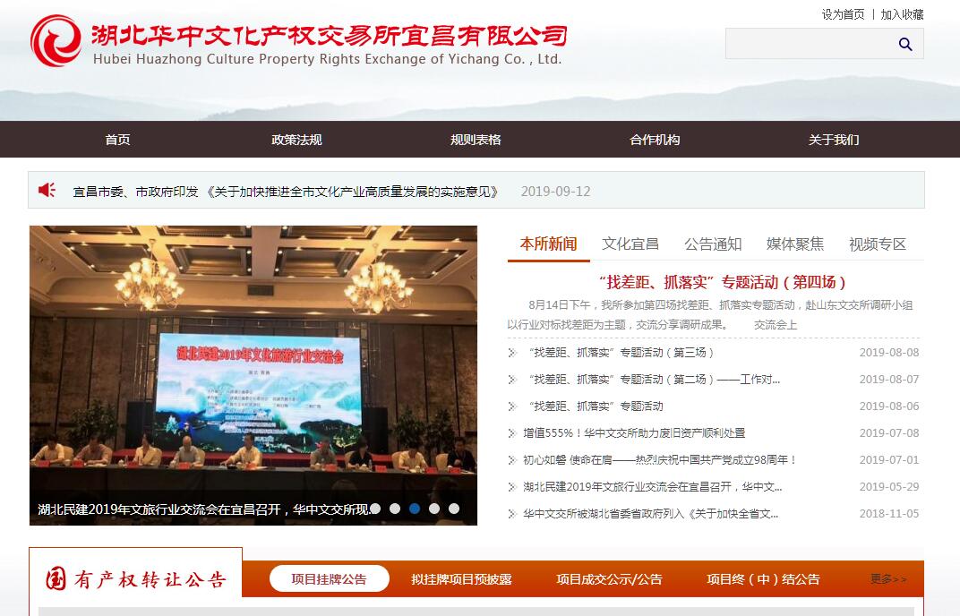 湖北华中文化产权交易所宜昌有限公司(简称“宜昌文交所”)是经湖北省人民政府、宜昌市人民政府批准,由湖北华中文化产权交易所和宜昌三峡广播电视台共同发起设立的综合性产权交易机构,以国有企事业单位资产、民营资产等为主要交易对象,也是全国地市州一级唯一获批设立的文化产权交易所。宜昌市人民政府高度重视宜昌文交所的发展:在《关于印发推进文化产业高质量发展重点工作责任分解方案和2019年重点文化产业项目建设任务分解方案的通知》中明确提出“支持华中(宜昌)文交所规范产权交易活动,做大交易规模。引导各类产权交易在文化产权交易机构实现进场交易,完善价值发现、价值实现和资源配置功能”。经营范围为:为传媒出版、影视音像、演艺娱乐、动漫游戏、工艺美术、文化教育、旅游、体育等产权及版权使用权提供交易及登记、托管、鉴证业务;文化旅游系统政府采购;会展服务;市场营销策划;为广播电视、出版刊物、户外媒体等广告招商;对文化旅游产业项目进行投资;为行政事业单位资产处置及企业股权交易、资产处置、改制重组提供交易、登记、托管、鉴证业务。宜昌文交所内设七大平台:1. 国有产权交易平台。宜昌文交所是宜昌市区域内唯一有资质从事国有文化企事业单位产权交易、增资扩股、资产处置的国有交易平台,该平台通过规范操作,能充分发现价格、发现投资者,充分契合国有资产管理要求,实现国有资产保值增值。通过集中各项交易资源,汇集形成资金洼地,发挥资本蓄水池集中效应,引入资本活水,构建资本市场的雏形,提高各类资源配置效率,高效推动全要素生产力发展。2. 文交拍卖平台。充分利用在全省文化艺术品及知识产权等无形资产交易市场中的影响力,定期举行文化艺术品及知识产权专场拍卖活动,活跃文化艺术品及知识产权等无形资产的交易活跃度,同时为各国有企业及行政事业单位的产权交易、增资扩股、资产处置、招租提供优质拍卖服务。3. 出版融合交易平台。以附着衍生数字出版内容及服务的纸质传媒出版物为交易对象,充分挖掘版权市场价值,助推出版发行企业及版权衍生服务企业构建稳定盈利模式,扩大出版融合产品推广渠道,实现产品价值提升,助推传统出版业转型升级。4. 文创金融服务平台。通过登记托管、招标发布、层级路演、融资挂牌交易等方式,提供覆盖全市大型及中小微文化企业的金融服务,着力挖掘旅游资源价值,为文化旅游产业项目提供包含门票收益权融资在内的专项金融服务,形成覆盖宜昌全市的文化资源聚集中心。5. 招投标代理平台。主要开展政府采购代理、各类项目招标代理、项目咨询管理等业务,力求以最佳的服务质量,满足社会各界的需要。6. 活动营销及专业会展平台。借助文化娱乐、创新时尚等多元化元素,依托会议会展、巡展路演、大型演出、学术论坛等多种传播形式,提供全方位的专业会展服务。7. 股权推荐上市平台。通过高效整合各类金融资源,为企业提供专业股份制改造服务,根据企业自身特点推荐企业进入主板、新三板及“湖北四板”挂牌,有效规范企业治理结构,协助企业高效利用多层次资本市场各类股权融资方式,提高直接融资比重,助力企业高效稳健发展。