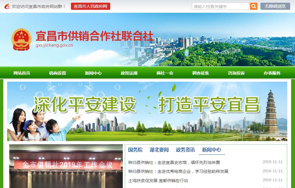 宜昌市供销合作社联合社是全市供销合作社系统的管理机构,属市政府领导。主要负责研究制定全市供销合作社的发展规划,指导全市供销合作社积极做好为“三农”服务工作,组织开放办社发展合作经济,协调同政府及有关部门的关系,对直属企事业单位行使管理、服务和出资人职能。经过半个世纪的艰苦奋斗及不懈努力,宜昌市供销合作社事业不断壮大,全市供销社系统辖13个县(市)区供销社,服务区人口400万,耕地257.7千公顷。横跨农资、棉花、果品、药材、再生资源、烟花爆竹、储藏运输、资产营运等行业。拥有独立核算企业130个,其中基层社77个,社有企业53个。员工总数1.3万人,资产总额12.3亿元,年实现购销总额25亿元。特别是近几年来,全市供销社与时俱进,积极探索社会主义市场经济条件下为农服务和自身发展的新路子,不断深化“四项改造”,加大改革力度,推进开放办社,整合优势资源,创新经营业态,强化为农服务,重构服务体系,打造供销社品牌,初步构建发展新框架。目前已兴办村级为农综合服务站960个,各类连锁店3400多个,农业产业化龙头企业18个,专业合作社31个,逐步形成“五化”(开放办社民营化、龙头企业产业化、专业合作社规范化、经营方式现代化、企业产权多元化)发展的新格局,使供销社真正成为助农增收、建设农村小康社会的服务主体。全市供销社改革和发展走在全国、全省系统前列,受到总社、省市领导的充分肯定。宜昌市供销合作社联合社被市委、市政府授予“文明单位”,被国家人事部、中华全国供销合作总社授予“先进单位”等荣誉称号。