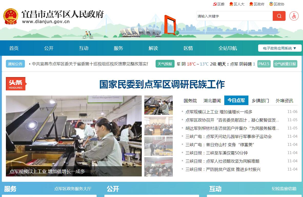 | 网站简介: 点军区隶属于湖北省宜昌市,位于宜昌城区长江南岸,地处东经111°,北纬30°,分别与宜都、长阳、夷陵等县市区接壤。点军区地势东部低,西部高,以山地、丘陵为主。点军区辖2个乡、2个镇、1个街道,总人口为105175人。2016年,点军区地区生产总值50亿元,地方公共财政预算收入3.6亿元。固定资产投资108亿元,社会消费品零售总额16亿元。外贸出口总额5900万美元,城镇、农村常住居民人均可支配收入分别为30400元、11635元。 |