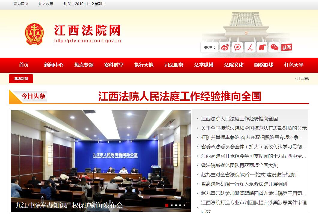 江西省人民法院创建于1949年7月1日,1955年3月更名为江西省高级人民法院。法院审判办公楼现坐落在南昌市红谷滩新区凤凰中大道。现有人员401人,正式在编人员中,本科以上学历占总人数的88.5%,其中博士4人,硕士132人,占总人数的33.8%。近年来,江西省高级人民法院坚持将法院工作融入全省重大战略决策实施之中,出台了服务发展升级、支持优势特色产业等多项措施。围绕构建“龙头昂起、两翼齐飞、苏区振兴、绿色崛起”区域发展格局、昌九一体化等战略决策,支持重点工程、重点产业,强化司法保障,促进富裕和谐秀美江西建设。严格落实公正司法第一责任,维护当事人合法权益,保障社会公平正义。2013年,全省法院受理各类案件236665件,结案234551件,分别上升1.53%和1.43%。一审服判息诉率为91.66%。江西高院受理各类案件1869件,结案1820件。近几年来,江西省高级人民法院分别荣获“全国精神文明建设工作先进单位”、“全国文明单位”、“全国法院先进集体”、“全国刑事审判工作先进集体”、“全国法院民事审判工作先进集体”、“全国法院知识产权审判工作先进集体”、“全国法院教育培训工作先进集体”、“全国法院司法统计工作先进集体”、“全国法院调研工作先进集体”、“全国法院信息工作先进单位”、“全国法院机关后勤工作先进集体”、“全国法院司法警察工作先进集体”、“全国法院审判监督工作先进集体”、“全国法院财务统计工作优秀单位”、“全国法院纪检监察先进集体”、“江西省文明单位”、“江西省人民满意公务员集体”等称号。