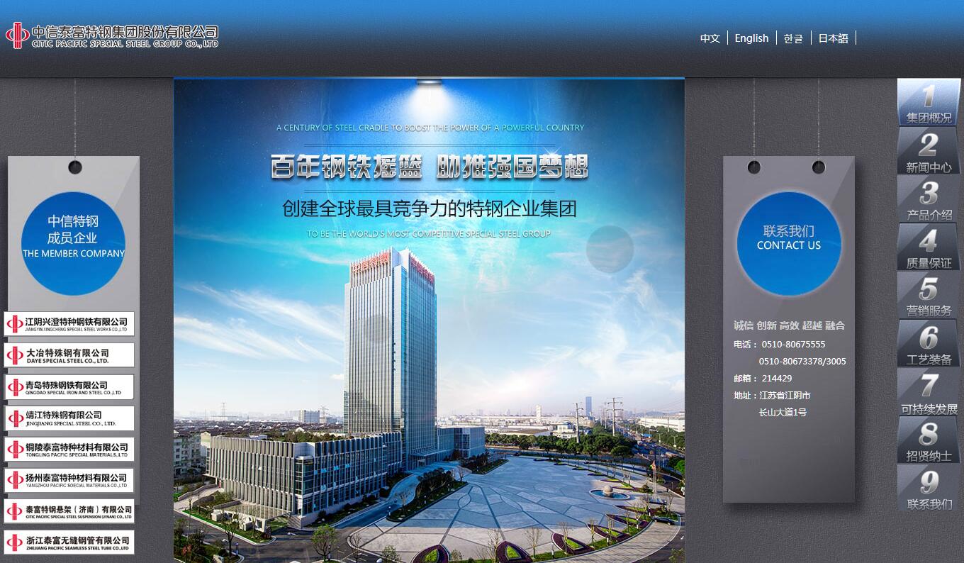 | 网站简介: 中信泰富特钢集团股份有限公司(简称中信特钢),是中国中信股份有限公司下属企业,集团旗下江阴兴澄特种钢铁有限公司、大冶特殊钢有限公司、青岛特殊钢铁有限公司、靖江特殊钢有限公司、铜陵泰富特种材料有限公司、扬州泰富特种材料有限公司、泰富特钢悬架有限公司和浙江泰富无缝钢管有限公司,形成了沿海沿江产业链的战略布局。中信特钢具备年产1300多万吨特殊钢生产能力,工艺技术和装备具备世界先进水平,是目前全球钢种覆盖面大、涵盖品种全、产品类别多的精品特殊钢生产基地,拥有合金钢棒材、特种中厚板材、特种无缝钢管、特冶锻造、合金钢线材、连铸合金圆坯六大产品群以及调质材、银亮材、汽车零部件、磨球等深加工产品系列,品种规格配套齐全、品质卓越并具有明显市场竞争优势,产品畅销全国并远销美国、日本以及欧盟、东南亚等60多个国家和地区,获得国内外高端用户的青睐。中信特钢秉承“诚信、创新、高效、超越、融合”的理念,以造福社会为己任,努力建设环境友好型、资源节约型和社会和谐型企业,着力创建全球最具竞争力的特钢企业集团。中信特钢竭诚与海内外各界朋友共创美好未来! |