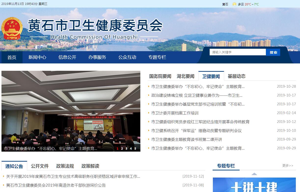 黄石市卫生健康委员会主要职责:(一)贯彻落实国民健康政策,起草卫生健康事业发展的政策、规划,制定地方标准和技术规范并组织实施。统筹规划全市卫生健康资源配置,指导区域卫生健康规划的编制和实施。协调推进健康黄石建设。制定并组织实施推进卫生健康基本公共服务均等化、普惠化、便捷化和公共资源向基层延伸等政策措施。(二)协调推进深化医药卫生体制改革,研究提出深化医药卫生体制改革重大政策、任务、措施的建议。组织深化公立医院综合改革,推进管办分离,健全现代医院管理制度,制定并组织实施推动卫生健康公共服务提供主体多元化、提供方式多样化的政策措施。提出医疗服务和药品价格政策的建议。(三)组织实施国家免疫规划,制定并落实全市疾病预防控制规划以及严重危害人民健康公共卫生问题的干预措施,组织开展传染病监测。负责卫生应急工作,组织指导突发公共卫生事件的预防控制和各类突发公共事件的医疗卫生救援。(四)组织拟订并协调落实应对人口老龄化政策措施,负责推进全市老年健康服务体系建设和医养结合工作。(五)贯彻落实国家药物政策和国家基本药物制度,开展药品使用监测、临床综合评价和短缺药品预警,提出符合全市实际的国家基本药物价格政策的建议,执行国家药典。组织开展食品安全风险监测评估,依法制定并公布食品安全地方标准。(六)负责职责范围内的职业卫生、放射卫生、环境卫生、学校卫生、公共场所卫生、饮用水卫生等公共卫生的监督管理,负责传染病防治监督,健全卫生健康综合监督体系。(七)负责制定全市医疗机构、医疗服务行业管理政策措施并监督实施,加强行风建设,建立医疗服务评价和监督管理体系。会同有关部门贯彻执行国家卫生健康专业技术人员资格标准。制定并组织实施医疗服务规范、标准和卫生健康专业技术人员执业规则、服务规范。(八)负责计划生育管理和服务工作,开展人口监测预警,研究提出人口与家庭发展相关政策建议,完善计划生育政策。(九)指导全市卫生健康工作,指导基层医疗卫生、妇幼健康服务体系和全科医生队伍建设。推进卫生健康科技创新发展。(十)负责市保健对象的医疗保健工作,承担市委、市政府重要会议与重大活动的医疗卫生保障工作。(十一)制定实施全市中医药发展规划,促进市中医药事业发展,推动全市中医药标准化和现代化。组织开展全市中医药人才培养、师承教育工作,推广中医药科技成果和适宜技术,传承和发展中医药文化。组织开展全市中药资源普查。加强中医药行业监管。(十二)归口管理市计划生育协会。(十三)完成上级交办的其他任务。