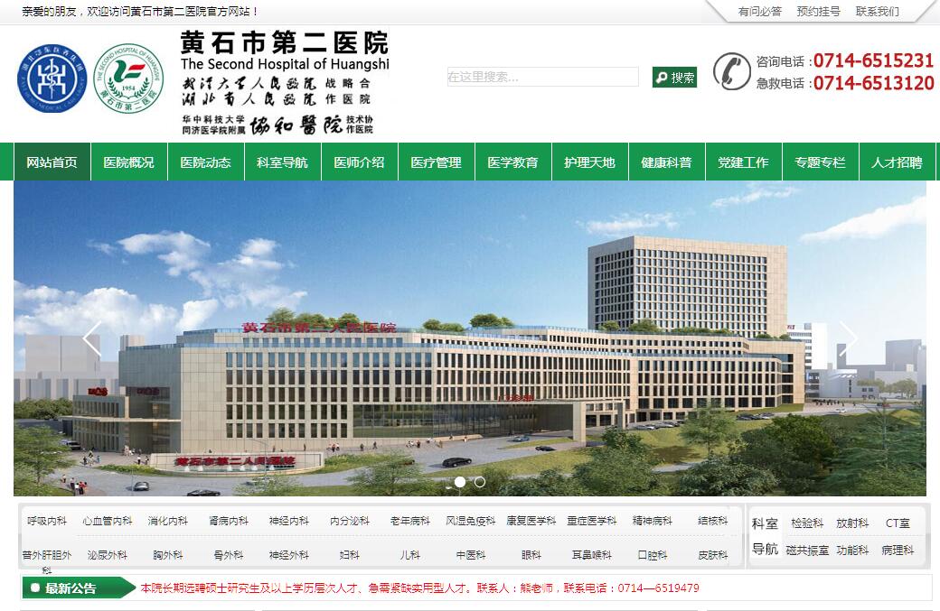 黄石市第二医院始建于1954年,经过六十多年的建设与传承,已经发展成为集医疗、急救、教学、科研、预防、保健为一体的三级综合性医院,同时也是黄石市职业病防治院、国际紧急救援网络医院、武汉大学人民医院战略合作医院、武汉协和医院技术协作医院,湖北科技学院、湖北中医药大学、湖北理工学院等医学院校的实习医院。医院现占地面积90亩,开放床位800张。现有在职职工897人,其中,高级技术职称116人,医学博士、硕士研究生41人,特聘博士、硕士研究生导师15人。享受国务院专家特殊津贴1人,享受省政府专家津贴1人。全国医德标兵1人,全国五一劳动奖章1人,湖北省突出贡献专家1人,黄石市突出贡献的中青年专家4人,市级名医3人。医院拥有西门子1.5T磁共振、飞利浦平板血管造影机、64排螺旋CT机、高清腹腔镜、电子支气管镜、电子胃镜肠镜等高、精、尖设备两百余台,形成了强有力、全方位的诊疗设备体系。医院专科齐全,开设43个临床医技科室,拥有呼吸科、检验科等2个省级临床重点专科,普外科、老年病科、职业病尘肺科、呼吸内科、精神科、检验科和泌尿外科等7个市级临床重点专科,急诊医学科和放射影像科2个市级临床重点建设专科。开展结核病诊治、腔镜手术、介入诊疗、血液净化治疗、传统及现代康复治疗、精神心理治疗、中医及中西医结合治疗、职业病防治等特色诊疗技术。设立陈孝平院士工作站、黄石市老年病研究所、烧伤皮肤病药物开发研究所。为了让优质医疗资源惠及更多百姓,医院建设有胜阳港社区卫生服务中心和黄石颐阳康复护理院,管理楠竹林社区日间照料中心。新建10万平方米的职业病综合大楼,项目建成后,将极大改善医院就医环境,为黄石及周边地区百姓提供更优质的健康服务。新思想引领新时代,新使命开启新征程。在习近平新时代中国特色社会主义思想的统领和指引下,医院坚持以“一切为了人民健康”为宗旨,奉行“医术精益求精、服务全心全意”的服务理念,秉承“爱岗敬业、创新图强”的医院精神,践行“诚信、科学、进取、奉献”的价值观,以建设现代化的三级甲等综合医院,打造区域医养融合中心为奋斗目标,努力构建人民满意的医院、职工幸福的家园。