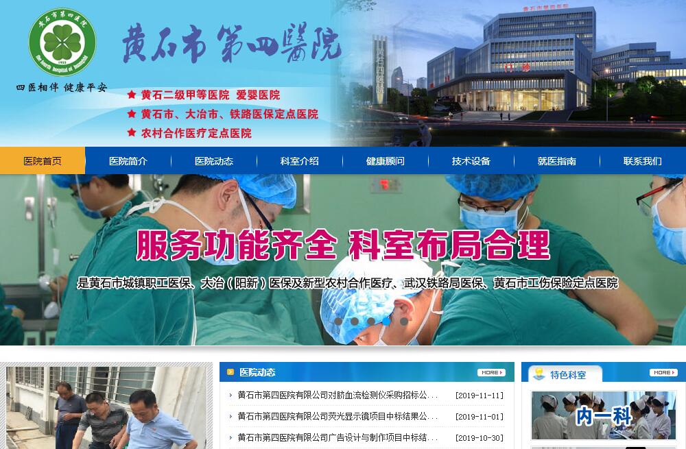 黄石市第四医院始建于1955年,经过60多年的建设与发展,已成为集医疗、急救、科研、教学、预防、康复、保健为一体,医疗技术力量雄厚的二级甲等综合医院,是铁山地区唯一的二级甲等优秀医院,医疗服务辐射到鄂东南及周边数十个乡镇,是黄石市城镇职工医保、大冶(阳新)医保及新型农村合作医疗、武汉铁路局医保定点医院。连续多年获得“湖北省文明单位”称号、市物价信得过单位、群众满意医疗单位、市十星级文明医院等,是国际紧急救援网络医院、国家爱婴医院。医院环境优美,占地面积43亩,开放床位400张,年门诊量15万余人次,年出院1.5万余人次。医院现有在职职工412人。其中,高级技术职称67人,医学硕士研究生12人,黄石市级“五一”劳模1人,特聘省市级名医4人。医院拥有美国通用16排螺旋CT、荷兰飞利浦彩超、美国史赛克腹腔镜、美国林弗泰克关节镜、美国强生超声刀、电子胃镜、输尿管镜、膀胱镜、碎石机、电子阴道镜、500maX光机、数字化胃肠机、骨科专用C臂X光机、进口全自动生化分析仪、高压氧舱等先进医疗设备和服务设施。医院临床学科齐全,创伤、妇产、新生儿和康复专科特色突出。设有内、外、妇、儿、五官、皮肤、康复、急诊120、重症ICU、血液净化、高压氧等36个临床医技科室,拥有创伤外科市级临床重点专科和普外科、神经内科、内分泌科、呼吸内科、妇产科、儿科、皮肤科及康复科等多个院级重点临床专科。医院高度重视业务创新发展,尤其近些年,依靠科技进步提升综合实力,大力加强学科建设和人才培养,新技术、新项目脱颖而出,开展了胆囊和妇科腹腔镜手术、妇科宫腔镜手术、骨科关节镜手术、髋关节置换术、膝关节置换术、翼状锁骨前置钢板治疗锁骨骨折、微创经皮空心钉内固定治疗腕舟骨骨折、老年性股骨近端骨折PFNA手术、一期复合植骨人工皮负压引流治疗创伤性骨髓炎、腰椎间盘突出症液体冲击疗法及微创手术、颅内血肿微创清除术、一次性开颅血肿清除术加骨瓣还纳内固定术等数十项新技术,有多项科技成果达国际先进、国内领先水平。2016年医院加入鄂东医养集团,2017年成功托管鹿獐山社区卫生服务中心。在集团的大力支持下,医院加速基础设施建设,调整学科结构,构建技术平台,优化门诊流程,升级改造住院大楼,改善医院环境,完善配套设施,新开设了重症医学科和新生儿科。医院大力支持鹿獐山社区卫生服务中心发展,并荣获“全国百强社区卫生服务中心”称号。以打造黄石城西区域医疗中心、鄂东南养老中心为目标的市四医院,将以“病人至上、严谨求精、仁德俱全、创新图强”的精神,努力为广大人民群众提供更好更满意的服务,促进医院跨越式发展。