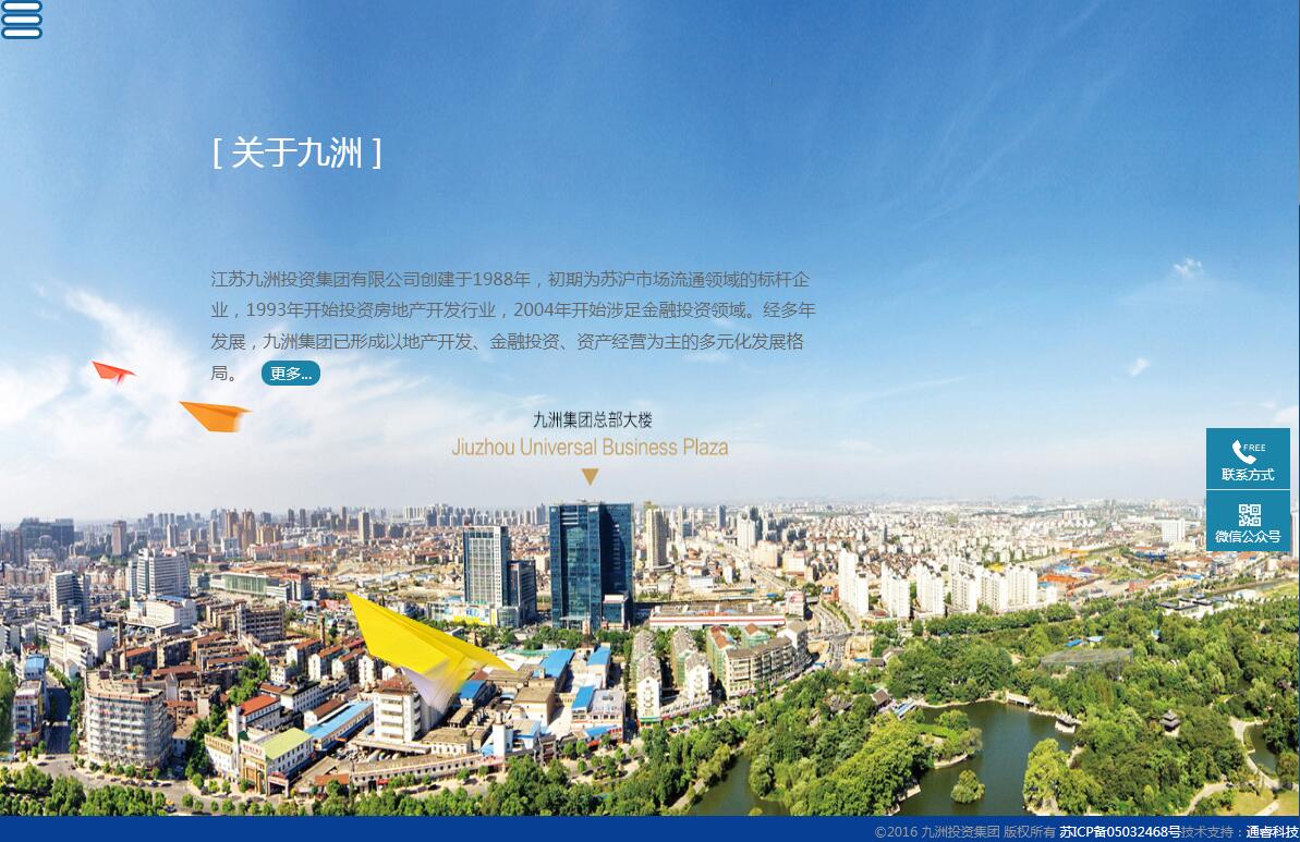 江苏九洲投资集团创建于1988年,初期为苏沪市场流通领域的标杆企业,1993年开始投资地产开发行业,2004年开始涉足创业投资领域。历经二十余载成长与积累,九洲集团已形成以创业投资、地产开发、资产经营为主的多元化发展格局。创业投资是九洲集团的核心竞争力。从2004年迈出资本运作的第一步起,九洲创投一步步发展壮大。目前九洲创投管理的基金规模达数十亿元,所投的高、新、绿项目都取得了较好的业绩,为中小企业转型升级起到了积极的推动作用。2015年,成立九洲创投园,用“创投资本+投后管理+高新绿企业”的新模式,建成了一个经营高新绿、服务高新绿、集聚高新绿的创新、创业园区。地产开发是九洲集团的常青树。自进军房地产业起,九洲本着“精雕细琢,打造精品”的开发理念,在常州及周边城市着力开发建成了20多个优秀住宅项目和商业地产项目,均得到了市场的热烈响应与追捧。资产经营是“百年九洲”的根基。在经营资产的过程中,九洲采取多种方式并行,坚持诚信经营,运作涵盖的商业资产涉及多个领域,包括超市租赁、市场招商、星级酒店、商务写字楼、城市综合体等,均取得了不俗的业绩。九洲集团发展不忘回报社会,作为常州市慈善总会副会长企业,各项捐赠累计超亿元。集团自2007年以来每年均被常州市政府评为“现代服务业五星级企业”,期间也先后获得省、市其他多项荣誉称号。