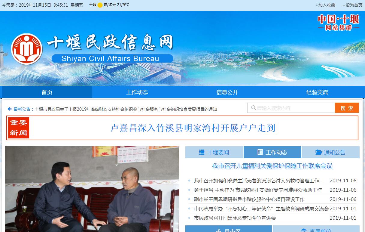 十堰市民政局主要职责:(一)根据我市国民经济和社会发展规划,拟订全市民政事业发展规划和年度工作计划;研究拟订民政工作有关规范性文件并组织实施和监督检查。(二)贯彻执行社会团体、民办非企业单位登记管理法规、政策;依法对社会团体、民办非企业单位进行登记管理和监察。(三)贯彻执行优抚法律、法规和政策,拟订实施办法并监督实施;负责全市现役军人、残疾军人、复员军人、烈士遗属、因公牺牲军人遗属、病故军人遗属、带病回乡退伍军人以及参战参试退役人员的抚恤定补、优待工作;负责对全市退役军人、因公致残国家机关工作人员、参战民兵民工等人员的残情评定和审核报批工作;负责承办烈士审核报批和褒扬工作,指导优抚事业单位管理工作;组织指导拥军优属工作,承办市拥军优属拥政爱民工作领导小组的具体工作,指导基层开展拥军优属、双拥创建工作。(四)贯彻执行复员退伍军人安置法规、政策;拟订地方性退役士兵、复员干部安置政策及计划;负责退役士兵、复员干部的接收安置工作;指导、监督市军用饮食供应站正规化建设,负责过往部队的军用饮食饮水保障工作。(五)负责军队移交地方政府安置管理的离退休干部、军队无军籍退休退职职工的接收安置及服务管理工作,指导全市军休机构的建设和管理工作。(六)拟订地方性救灾工作规范性文件;负责组织、协调救灾减灾工作,组织自然灾害救助应急体系建设;负责灾情组织核查和统一发布灾情;管理、分配救灾款物并监督使用;组织、指导救灾捐赠;承办市减灾委员会、市自然灾害应急指挥部的具体工作。(七)牵头拟订地方性社会救助规划、政策和标准,健全城乡社会救助体系;负责城乡居民最低生活保障、五保供养、孤儿救助、医疗救助、临时救助、生活无着人员救助工作。(八)贯彻执行行政区划、地名管理法规、政策,拟订地方性行政区划管理和行政区域界线、地名管理办法、规划;负责县级以下行政区域的设立、命名、变更和政府驻地迁移的审核上报工作;组织、指导全市行政区域界线的勘定和管理工作;负责地名命名、更名、销名审核工作。(九)拟订城乡基层群众自治建设和社区建设政策;指导社区服务体系建设;提出加强和改进城乡基层政权建设的建议,推动基层民主政治建设;指导基层群众自治组织和社区组织干部表彰工作。(十)拟订社会福利事业发展规划、政策和标准;拟订社会福利机构管理办法和福利市场发展计划;拟订促进慈善事业发展的政策、规划;组织、指导社会捐助工作;指导老年人、孤儿和残疾人等特殊群体权益保障工作。(十一)拟订地方性婚姻管理、殡葬管理和儿童收养工作的政策和办法;负责推进婚俗和殡葬改革,指导婚姻、殡葬、收养、救助服务机构管理工作。(十二)会同有关部门按规定拟订民政社会工作发展规划、政策和职业规范,推进社会工作人才队伍建设和相关志愿者队伍建设。(十三)为大企业提供“直通车”服务。(十四)承办上级交办的其他事项。