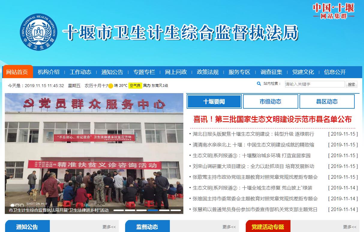 十堰市卫生计生综合监督执法局主要负责实施管辖范围内的卫生计生专项整治和日常监督检查;对公共场所、生活饮用水卫生、学校卫生及消毒产品和涉及饮用水卫生安全产品进行监督检查;对医疗机构、采供血机构及其从业人员的执业活动进行监督检查,查处违法行为;打击非法行医和非法采供血,整顿和规范医疗服务秩序;对职业健康检查、职业病诊断和放射诊疗工作进行监督检查,查处违法行为;对医疗机构、采供血机构、疾病预防控制机构的传染病疫情报告、疫情控制措施、消毒隔离制度执行情况、医疗废物处理情况和菌(毒)种管理情况等进行监督检查,查处违法行为;对医疗机构、妇幼保健计划生育服务机构服务内容和从业人员行为进行监督,依法打击“两非”行为,做好计划生育违法违纪案件的督查督办;对医疗机构医疗广告实施监督管理;对县市区卫生计生综合监督执法进行指导和督查,对卫生计生监督协管员培训等工作进行指导;负责食品安全标准的宣贯、跟踪评价以及食品安全企业标准的备案管理;负责相关卫生监督应急管理工作;负责行政区域内卫生计生监督信息的收集、核实和上报;开展卫生计生执法工作稽查,受理对违法行为的投诉、举报;开展卫生计生法律法规宣传教育和执法检查;完成卫生计生行政部门交办的其它工作。