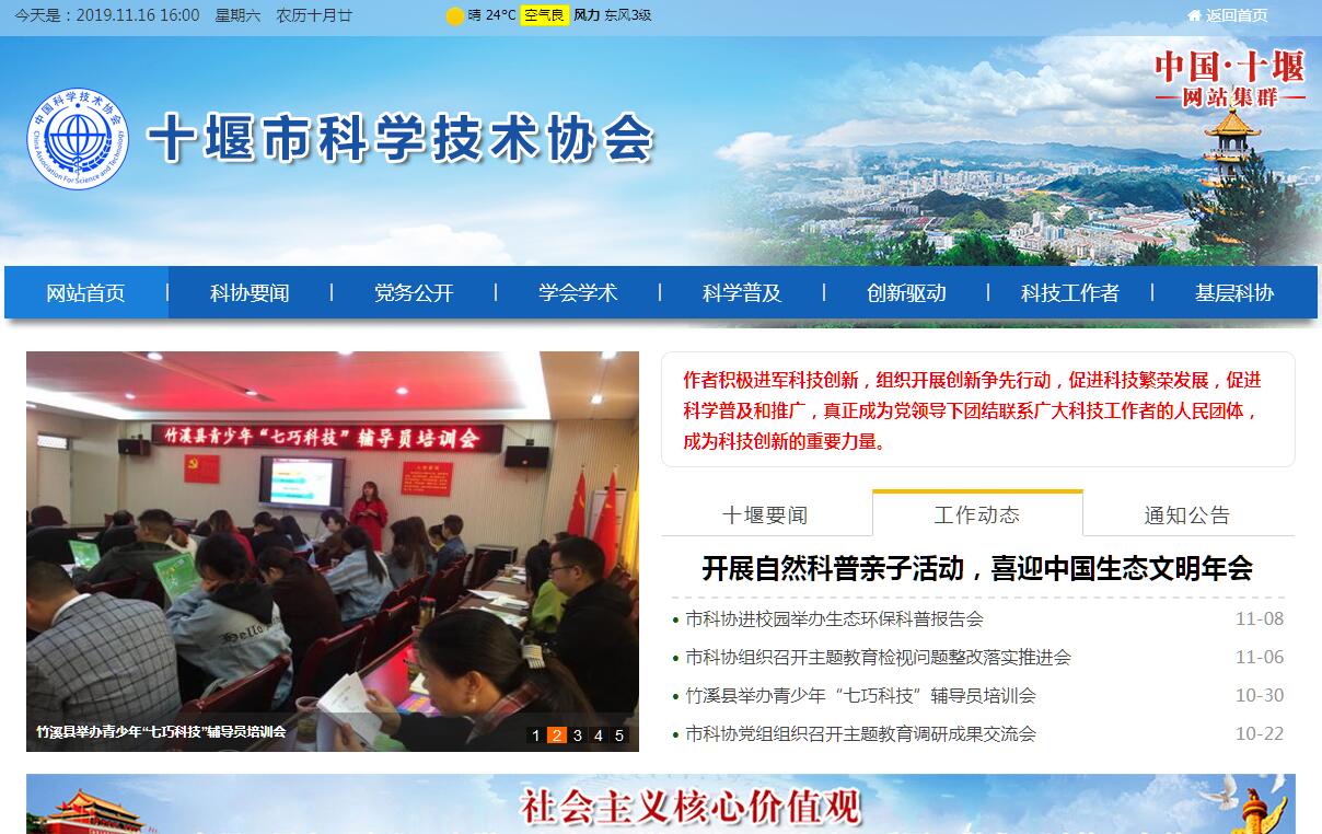 十堰市科学技术协会(以下简称十堰市科协)是十堰市科技工作者的群众组织,是中共十堰市委领导下的人民团体,是党和政府联系科学技术工作者的桥梁和纽带,是推动十堰市科学技术事业发展的重要力量。市科协成立以来,坚持围绕中心、服务大局,立足自身职能,广泛团结和动员科技工作者开展科学普及、学术交流、人才培养、服务企业等工作,促进科技创新和人才成长,为十堰科技、经济、社会发展作出了积极贡献。现十堰市科协由原十堰市科协和郧阳地区科协合并而成。原十堰市科协成立于1979年2月,十堰市二汽革命委员会批准成立“十堰市及第二汽车制造厂科学技术协会”第一届委员会。郧阳地区科协成立于1982年3月。1994年10月,郧阳地区、十堰市合并,郧阳地区科协、十堰市科协随即合并为现在的十堰市科协,并于1996年12月5日召开了十堰市科协第一次代表大会。之后分别于2002年10月、2007年11月、2012年12月、2018年1月先后召开了十堰市科协第二次、第三次、第四次、第五次代表大会。十堰市科协由全市学会、协会、研究会(以下简称学会)和下属基层科协组成,有8个县(市、区)科协、54个市级学会、24家企业科协和2个高校科协。十堰市科协每5年举行一次全市代表大会,选举产生领导机构——全市委员会。全市委员会会议每年召开一次,闭会期间由其常设机构常务委员会行使职权。十堰市科协的办事机构是十堰市科协机关,下设办公室、普及部、组宣部、学会部4个职能部门。根据科协事业发展的需要,设置了十堰市科学技术馆、十堰市青少年科技中心和十堰市院士专家联络服务中心3个直属事业单位。十堰市科协深入贯彻习近平总书记关于科协工作的重要指示精神,围绕保持和增强科协组织“政治性、先进性、群众性”的要求,坚持为科技工作者服务,为创新驱动发展服务,为提高全民科学素质服务,为党和政府科学决策服务,努力为十堰市建设区域性中心城市献计出力。主要开展以下职能工作:一是牵头组织实施“科学素质工程”,开展科学普及,提升全民科学素质;二是管理指导市级自然科学学会,开展学术交流,促进学科、科技的繁荣与发展;三是联系服务广大科技工作者,表彰宣传举荐优秀科技工作者,促进科技工作者成长成才、脱颖而出;四是广泛凝聚科技工作者的智慧,围绕科技进步、经济建设和社会发展中的重大问题建言献策,服务党委政府科学决策;五是搭建各种创新服务平台,开展院士专家工作站和“企业科技信息服务推广应用平台”建设等,促进产学研用结合,助力创新驱动发展。