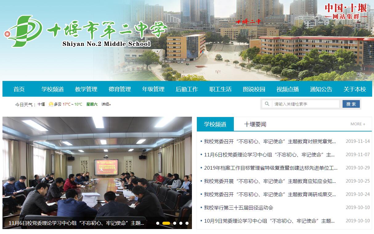 十堰市第二中学是十堰市最大的一所完全中学,现有88个教学班,学生近5000人,其中高中46个教学班,学生2600人;初中42个教学班,学生2300人。学校现占地面积100000平方米,校园环境优美,绿树成荫,已建成的教学区、运动区、生活区布局合理,格调高雅。学校现代化教学设施日趋完备,活动场地充足,功能齐全,是读书学习的理想场所。初中中考升学率连续多年城区第一;高中办学水平综合评定居全市同类高中第一;体育、美术特长生培养形成特色、规模,已成为学生向往、家长满意、社会信任的现代化学校。学校遵循“育人为本,和谐发展”的办学理念,立足学生终身发展,坚持“成才先成人”的教育思想,积极倡导教学方式和学习方式的转变,狠抓教研教改质量,扎实推进素质教育,始终追求办有理想的教育、有特色的学校。30多年来,学校教育教学成绩斐然:高考连创佳绩,中考一直保持领先地位,特长教育形成规模、特色。学校体育队长期代表十堰市在国家、省市重大体育比赛中摘金夺银。十堰二中先后荣膺“全国学校体育卫生工作先进单位”、“湖北省文明单位”、“湖北省教改实验学校”、“湖北省安全文明校园”、“十堰市最佳文明单位”、“十堰市人民满意学校”、“十堰市普通高中示范学校”等多项殊荣。
