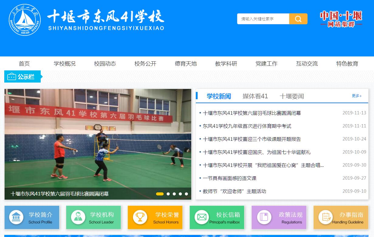 凌云塔下,艳湖之滨,有一座宁静而富有生机的学校——十堰市东风41学校。创办四十年,由刚开始的80余名学生到现在的1700多名学生,41学校经历了质的飞跃。近几来,41学校更是以优美的校园环境、过硬的教学质量迎来了学校跨越式的发展。优异的教学成绩,扎实有效的德育活动,一支“师德高、观念新、业务精、能力强”的教师队伍,让41学校 “办一流教育,创品牌名校”的美好蓝图逐步展开画卷。一流的校园环境,一流的教育教学设施,一流的教职工队伍,再加上一流的管理水平,使41学校步入了加快发展的快车道。学校被湖北省教科所评选为“教育科研实验基地学校”、 “中学化学研究性学习实验学校”、“发现学习法与中学数学教学研究实验学校”、“湖北省小学语文综合阅读实验学校”;东风教育分局授予“信息技术教育试验学校”、“教育科研先进单位”、“质量管理年先进单位”“质量品牌建设年先进单位”……今年学校初三中考名列分局第二,其它年级也取得了优异的成绩,绝大部份学科名列联考学校前列。成绩让人刮目,业绩令人鼓舞。这一串串另人欣喜的数字铸就了41学校在东风教育中的霸主位置,这些数字的背后更凝聚着41学校全体师生员工的智慧、汗水和不懈的努力!辛勤的耕耘换来桃李的芬芳,腾飞的蓝图绘就了41学校时代华章。新的学年,新的起点,41学校现在又站到了新的起跑线上。他们将把眼光盯在创建一流名校的目标上,携手全体教职员工,不辍耕耘、高歌猛进,为构建和谐社会、创造41教育美好的明天而奋斗!