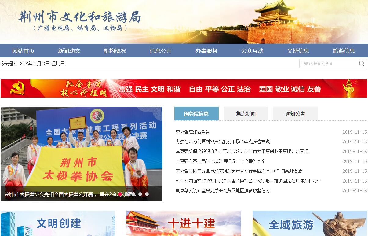 荆州市文化和旅游局主要职责:(一)贯彻落实党和国家文化、旅游、广播电视、体育、文物工作的方针政策和法律法规,研究拟订全市文化和旅游政策措施。(二)统筹规划全市文化事业、文化产业及旅游业发展,拟订发展规划并组织实施,推进文化和旅游融合发展、体制机制改革。(三)管理全市性重大文化、旅游、体育活动,指导市文化和旅游重点设施、公共基础设施建设,组织全市旅游整体形象和重点品牌推广,促进文化、旅游、体育产业对外合作和市场推广,制定全市旅游市场开发规划并组织实施,指导推进全域旅游。(四)指导管理全市文艺事业,指导艺术创作生产,扶持体现社会主义核心价值观、具有导向性代表性示范性的文艺作品,推动各门类艺术、各艺术品种发展。(五)负责全市公共文化事业发展,推进公共文化服务体系建设和旅游、体育公共服务建设,深入实施文化惠民工程,组织实施重大公益工程和公益活动,推进基本公共文化服务标准化、均等化。(六)指导全市文化、旅游科技创新发展,推进信息化、标准化建设。(七)负责全市非物质文化遗产保护,拟订非物质文化遗产保护规划,推动非物质文化遗产的保护、传承、普及、弘扬和振兴。(八)指导管理全市文物和博物馆事业,负责全市文物的保护、抢救、发掘、研究和展示利用工作,指导协调重大文物保护和考古项目的组织实施,指导文物、博物馆管理机构业务建设,负责市级以上文物保护单位的申报、保护、维修、利用工作,指导监督大遗址保护管理与建设工作。(九)统筹规划全市文化、旅游和体育产业,组织实施文化和旅游资源普查、挖掘、保护和利用工作,促进文化、旅游和体育产业发展。(十)指导全市文化和旅游市场发展,对市场经营进行行业监管。依法规范市场,实施依法设定的行政许可,推进行业信用体系建设。负责全系统安全监督管理工作,负责全市旅游安全的综合协调和监督管理,承担全市旅游经济运行监测。(十一)组织指导全市文化市场综合执法,组织查处全市性、跨区域文化、文物、出版、广播电视、电影、旅游等市场的违法行为,督查督办重大案件,维护市场秩序。(十二)负责全市广播电视行业管理,负责对广播电视、网络视听节目服务机构和业务的监管。推进广播电视与新媒体新技术新业态融合发展。指导监管广播电视广告播放。负责广播电视节目传输覆盖、监测和安全播出监管。指导推进应急广播建设。(十三)指导管理全市群众体育工作,推行全民健身计划纲要,指导并开展群众性体育活动,推动建立和完善全民健身服务体系。指导国家体育锻炼标准实施,开展国民体质监测。负责对公共体育设施的监督管理。(十四)统筹规划全市竞技体育发展,指导全市体育运动项目的设置与布局。指导和推进青少年体育工作,指导全市体育训练、竞赛、青少年业余训练队伍建设。组织协调、监督全市体育运动中的反兴奋剂工作。负责市级以上综合性体育竞赛,组织参加国内和省内重大体育竞赛。(十五)指导管理全市文化和旅游宣传推广和对外交流合作,组织开展大型交流推广活动,推动荆楚文化走出去。(十六)完成市委、市政府交办的其他任务。