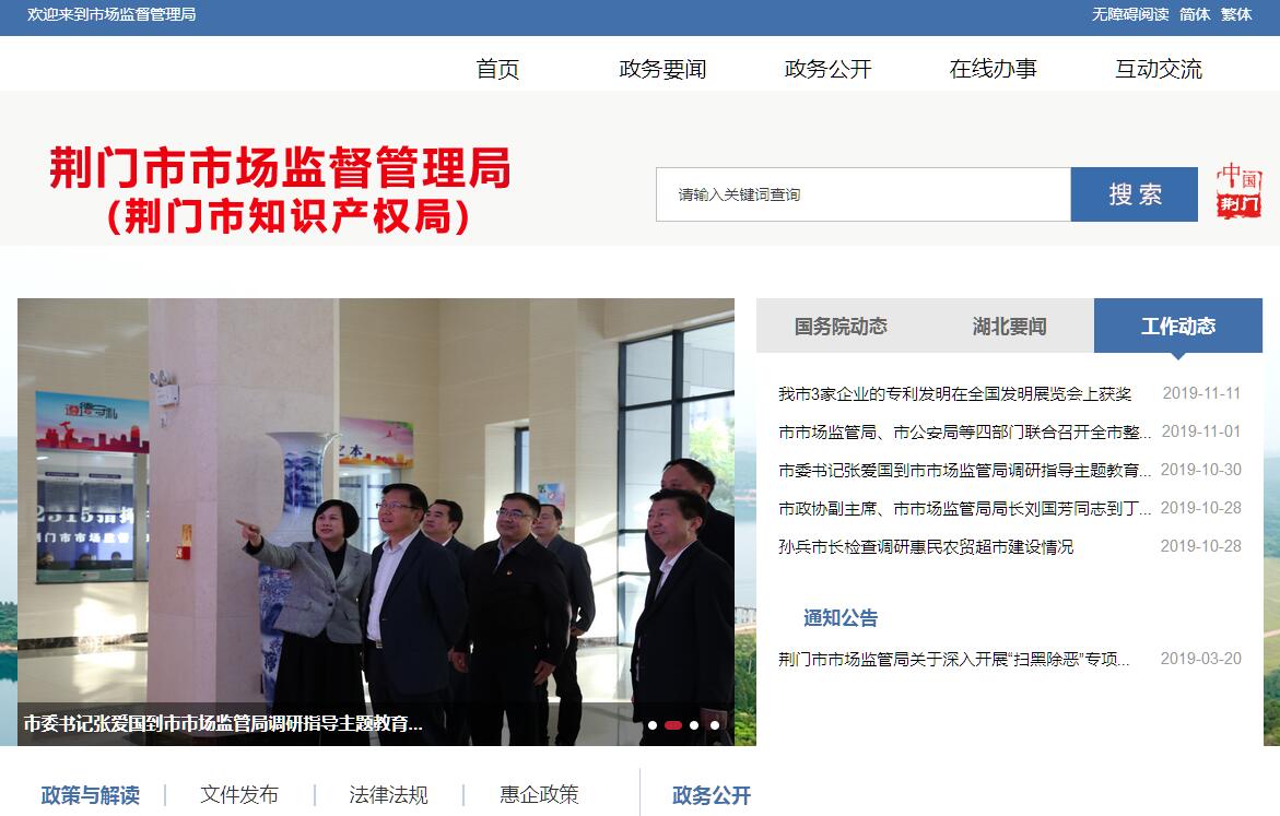 荆门市市场监督管理局主要职责:一、负责市场综合监督管理。贯彻执行国家、省市场监督管理的方针政策和法律法规,组织实施质量强市、食品安全、标准化等战略,拟订并组织实施有关规划,规范和维护市场秩序,营造诚实守信、公平竞争的市场环境。二、负责市场主体统一登记注册。指导各类企业、农民专业合作社和从事经营活动的单位、个体工商户,以及外国(地区)企业常驻代表机构等市场主体的登记注册工作。建立市场主体信息公示和共享机制,依法公示和共享有关信息,加强信用监管,推动市场主体信用体系建设。三、负责组织和指导市场监管综合执法工作。指导县(市、区)市场监管综合执法队伍建设,推动实行统一的市场监管。组织查处重大违法案件和有重大影响的跨区域案件。规范市场监管行政执法行为。四、依据委托对经营者集中行为进行监督和反垄断审查。配合上级市场监管部门对涉嫌垄断行为进行调查。五、负责监督管理规范市场秩序。依法监督管理规范市场交易、网络商品交易及有关服务行为。组织指导查处价格收费违法违规、不正当竞争、违法直销、传销、侵犯商标专利知识产权和制售假冒伪劣行为。组织实施合同行政监督管理。指导广告业发展,监督管理广告行为。依法查处无照生产经营和相关无证生产经营行为。指导市消费者委员会开展消费维权工作。六、负责宏观质量管理。拟订实施质量发展的制度措施。统筹质量基础设施建设与应用,会同有关部门组织实施重大工程设备质量监理制度,组织重大质量事故调查,贯彻实施缺陷产品召回制度,监督管理产品防伪工作。七、负责产品质量安全监督管理。负责产品质量监督抽查和安全风险监控工作。组织实施质量分级制度、质量安全追溯制度。负责工业产品生产许可管理。负责纤维质量监督管理工作。八、负责特种设备安全监督管理。负责特种设备安全监察、监督工作,监督检查高耗能特种设备节能标准和锅炉环境保护标准的执行情况。九、负责食品安全监督管理综合协调。贯彻落实食品安全政策措施,统筹指导食品安全工作。负责食品安全应急体系建设,组织指导重大食品安全事件应急处置和调查处理工作。建立健全食品安全重要信息直报制度。十、负责食品安全监督管理。建立覆盖食品生产、流通、消费全过程的监督检查制度和隐患排查治理机制并组织实施,防范区域性、系统性食品安全风险。推动建立食品生产经营者落实主体责任的机制,健全食品安全追溯体系。组织开展食品安全监督抽检、风险监测、核查处置和风险预警、风险交流工作。十一、负责统一管理计量工作。推行国家法定计量单位;执行国家计量制度;管理计量器具及量值传递和比对工作。规范、监督商品量和市场计量行为。十二、负责统一管理标准化工作。依法协调指导和监督地方标准、团体标准的制修订工作;规范标准化行为;综合协调标准化事业发展,推进建立支撑高质量发展的标准体系。十三、负责统一管理检验检测工作。规范检验检测市场,完善检验检测体系,指导协调检验检测行业发展。十四、负责统一管理、监督和综合协调认证认可工作。依法监督管理认证认可和合格评定工作。十五、负责市场监督管理科技和信息化建设、应急管理、新闻宣传、对外交流与合作。按规定承担技术性贸易措施有关工作。十六、负责贯彻落实国家、省关于药品、医疗器械和化妆品监督管理的方针政策和法律法规。负责组织指导权限范围内药品、医疗器械和化妆品监督检查及不良事件监测、处置,依职责组织查处药品、医疗器械、化妆品生产、经营和使用环节的违法行为。十七、负责组织协调知识产权保护。推动知识产权保护工作体系和信用体系建设;研究鼓励新领域、新业态、新模式创新的知识产权保护、管理和服务政策;负责知识产权争议处理、维权援助和纠纷调处,组织指导知识产权预警和涉外保护工作;负责组织指导商标、专利执法工作,维护良好的知识产权市场秩序;依法加强商标、专利、原产地地理标志和官方标志等知识产权的保护力度。十八、负责促进知识产权运用。拟订知识产权运用和规范交易政策措施,促进知识产权转移转化;规范知识产权无形资产评估工作;统筹指导知识产权公共服务体系建设,推动知识产权信息传播利用;指导和促进知识产权服务业发展,依法监管知识产权中介服务机构。十九、完成上级交办的其他任务。
