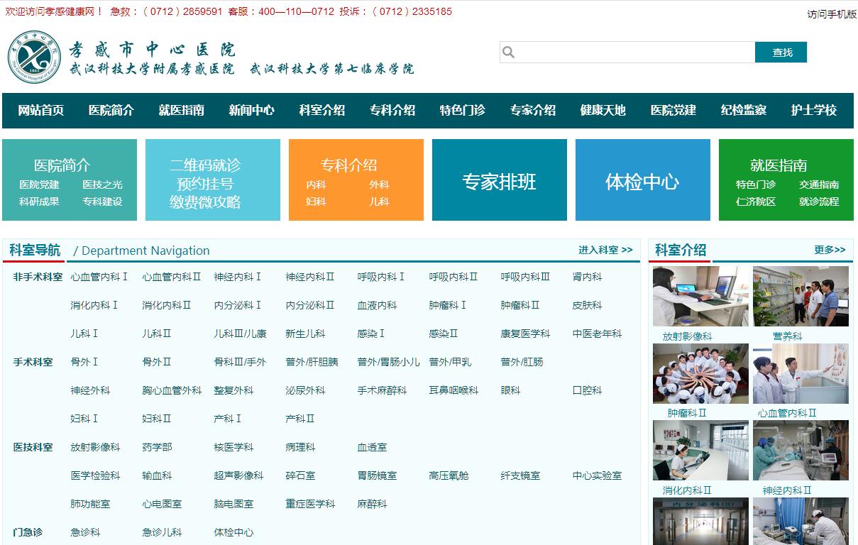 孝感市中心医院是武汉科技大学附属医院,始建于1862年,其前身为英国传教士杨格菲·约翰博士在孝感创建的一所小诊所。历经一个半世纪的风雨洗礼,现已发展成为一所集医疗、教学、科研、保健、康复于一体的国家“三级甲等”大型综合医院,国际爱婴医院、亚洲国际紧急救护中心网络医院;是国家卫计委脑卒中筛查与防治基地、国家和湖北省“高级卒中中心”、“中国标准胸痛中心”、全国综合医院中医药工作示范单位、“湖北省法治建设示范医院”;也是国家住院医师规范化培训基地及国家全科医师培养基地。医疗辐射鄂东地区及毗邻地区,担负着孝感市530万人民的医疗保健和卫生服务任务。医院本部位于孝感市广场路6号,占地面积115亩,建筑总面积18万平方米,拥有19层外科楼、16层门诊楼、8层内科楼、12层医技楼、5层急诊楼、10层教学楼、10层仁济院区大楼。即将峻工的占地5万平方米的内科综合楼,将于2019年投入使用。医院拥有固定总资产9.5亿多元,拥有GE公司动态500排宝石CT、德国西门子3.0T核磁共振、平板式全数字化X光机(DSA)、数字化平板乳腺机、数字平板血管机、德国西门子直线加速器、单光子发射型计算机断层仪(ECT)、DR、CR、彩色多普勒超声诊断仪、各种类型内窥镜及自动药房系统等一大批先进医疗设备,总值近4亿元。医院核定床位2000张,开放床位1850张;学科门类齐全,专业设置精细,设有59 个临床科室、10个医技科室 、29个行政职能科室;拥有输血科、内分泌科、放射影像科、呼吸内科、儿科、新生儿科、心血管内科、皮肤科、核医学科等9个省级重点专科及普外科等35个市级重点专科年。年出院6.9万余人次、年均门诊量105万余人次、年手术2.8万余台次。医院拥有一支强大的人才队伍,全院现有员工2032人,其中卫生专业技术人员1755人,卫生高级专业技术人员350人;国家二级岗位3名、三级岗位19名,享受国务院及省政府津贴专家9人、湖北省有突出贡献中青年专家1人、孝感市有突出贡献专家7人、孝感市优秀人才1人、孝感市知名中医1人、市“121”培养对象14人、硕士生导师36人;医学硕士、博士386名。2011年以来,医院共开展新技术项目752项,以微创技术、介入治疗技术、干细胞、骨髓移植技术和分子诊断技术为支撑,逐步形成了一批具有社会影响力的专科品牌。如神经内科的急性脑血管病动静脉溶栓与介入取栓、心血管内科的急诊PCI与主动脉覆膜支架开窗置入术治疗Ⅰ型主动脉夹层、呼吸内科开展的气管内粒子支架植入术、肾内科的开展超声引导下动静脉内瘘球囊扩张术、妇科一病区在省内率先开展盆底重建术、康复科开展的超声介导药物靶向递送技术等都在省内处于领先水平。2011年以来,医院有52项科研成果通过鉴定,其中有50项获国内领先水平,11项获孝感市科技进步奖。承担吴阶平基金会立项科研2项、国家卫计委立项科研2项,省级科研立项38项,市级27项,获国家发明专利4项,实用新型专利155项;发表中国科技论文统计源期刊论文1409篇, 其中SCI论文17篇;出版专著128部。“十三五”期间,医院制定了“夯基、品牌、飞跃”三步走的中长期战略规划,确定了“做行业典范,建一流名院”战略发展目标,奠定了“一主四翼”的发展格局。围绕战略发展目标,不断优化医院管理的顶层设计,持续推进“落实标准、依规治院”管理理念,始终坚持“文化建院、人才强院、科教兴院、质量立院”四大方针,积极推进学科建设、科技创新和“微孝”优质服务“三项工作”,全面加强医院党的建设和精神文明建设,通过创新驱动、转型升级、提质增效提升核心竞争力;通过人才培养、绝活破局、科研教学培育拳头产品;通过携手共建、合作共赢、开放共享,推动医联体发展。坚持以病人为中心,实施“大医院,细管理”,建立和完善科学、规范、高效、合理的医院质量考评体系与绩效分配制度,通过管理精细化、手术微创化、内科手术化、医技精准化的“四化”管理手段,落实医院“安全运行五级管理”制度,致力医疗质量的持续改进, 倾情推行“微孝服务”,努力改善患者就医体验。在学科发展、人才培养、医疗服务、科研教学等方面不断进行管理改革创新。多次获得“湖北省卫生系统先进单位”、“孝感市文明单位”、“百姓放心医院”、“行风建设先进单位”等荣誉称号。