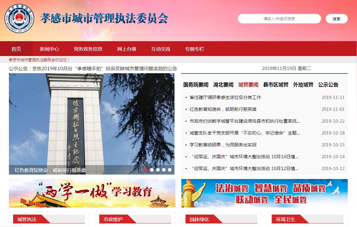 孝感市城市管理执法委员会主要职责:(一)负责贯彻执行城市执法管理的方针、政策,起草有关地方性法规、规范性文件,编制城市管理工作发展战略总体规划、中长期发展规划、专项规划和各项年度计划,拟订相关管理标准,制定城市管理工作规范和行政执法行为规范。(二)负责主城区生活垃圾末端处置设施的建设维护和管理;负责管辖范围内(指孝感主城区10条重要路段和8个重点区域,下同)的环境卫生管理工作。(三)负责主城区大型户外广告设置、建筑渣土运输处置的管理;负责管辖范围内的建筑物立面管理、小型户外广告和门店牌匾设置、报刊亭和公交候车亭等“城市家具”设置及其他占用公共空间乱搭乱挂的管理工作。(四)负责主城区地下管线、管网、管沟、管廊的管理、督查工作;负责管辖范围内的市政公用设施运行管理工作。(五)负责管辖范围内的城市园林绿化管理工作(六)负责管辖范围内的道路扬尘治理、城区河道和湖泊垃圾污染治理、露天油烟、生活噪声治理工作。(七)负责主城区大型停车设施的规划、建设和管理;负责管辖范围内的公共自行车运行管理、便道机动车及非机动车停放管理、便道机动车停车场及临时泊位设置管理工作;(八)负责管辖范围内的城区防汛、道路清融雪、公园和广场应急避难场所管理,以及城市道路、桥梁、照明、园林绿化的应急保障和市政管线、管网、管沟、管廊的应急管理工作。(九)在主城区管辖范围内行使下列行政处罚权:1、行使住房城乡建设领域法律法规规章规定的全部行政处罚权;2、环境保护管理方面社会生活噪声污染、建筑施工噪声污染、建筑施工扬尘污染、餐饮服务业油烟污染、露天烧烤污染、城市焚烧沥青塑料垃圾等烟尘和恶臭污染、露天焚烧秸秆落叶等烟尘污染、燃放烟花爆竹污染等的行政处罚权;3、工商管理方面户外公共场所无照流动商贩的行政处罚权;4、交通管理方面侵占城市道路、违法停放车辆等的行政处罚权;5、水务管理方面向城市河道倾倒废弃物和垃圾及违规取土、城市河道违法建筑物拆除等的行政处罚权;6、食品药品监管方面在户外公共场所违法摆摊设点从事食品经营,以及违法回收贩卖药品等的行政处罚权。(十)指导、协调、督察、考核全市城市执法管理工作;组织实施跨区域执法活动;查处城市执法管理重要案件;组织全市城市执法管理的宣传教育和业务培训。(十一)指导全市智慧城管信息平台建设、运行,负责主城区城市管理案件的受理、派遣、指挥、督办。(十二)承办上级交办的其他事项。