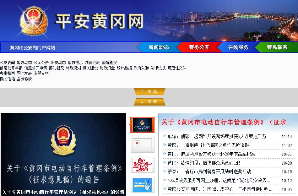 黄冈市公安局主要职责:(一)根据公安工作的方针政策和部署,结合本市实际,研究、部署全市公安工作,并督促贯彻执行。(二)掌握影响稳定、危害社会治安情况,分析形势,制定对策。(三)组织、指挥、协调对恐怖活动的防范、侦查工作。(四)组织、指导、监督全市公安机关加强对社会治安管理,依法查处破化社会治安秩序的行为;依法管理危险物品、特种行业和公共场所的治安等工作。(五)指导、监督国家机关、社会团体、企事业单位和重点建设工程的治安保卫组织和保安队伍建设。(六)指导、监督全市禁毒缉毒工作,承担市禁毒委员会办公室的日常工作。(七)负责全市出入境管理及外国人、华侨、港澳居民在市内停留居留有关管理工作;组织协调涉外案件查处。(八)领导和监督全市消防工作;指导、监督、协调全市消防监督、火灾预防、火灾扑救和公安应急抢险救援工作。(九)指导、监督全市公安机关对公共信息网络的安全保护工作,打击信息网络违法犯罪。(十)指导、监督全市公安机关承担的执行刑罚工作,直接管理市看守所、市拘留所以及市公安局强制隔离戒毒所。(十一)依法管理全市道路交通安全,维护交通秩序;负责机动车辆(不含拖拉机)、驾驶员管理工作。(十二)组织、规划全市公安法制建设,检查、监督全市公安机关的执法活动。(十三)拟订全市公安科技发展规划并组织实施,负责公安信息化、刑事技术和行动技术建设,组织、指导、监督实施安全技术防范工作。(十四)负责全市公安机关装备、被装配备以及项目建设、基础设施建设的计划、申报、分配和管理;落实上级公安机关警务保障措施和标准;负责申报市公安局及分公安局业务经费、专项拨款的分配计划,监督其管理、使用情况。(十五)对武警部队执行公安任务实施领导和指挥。(十六)拟订全市公安机关的人员教育训练和宣传工作计划,并检查、督促落实。按权限规定管理公安系统的机构编制和警衔工作,协助做好民警录用和协管干部管理工作,管理市公安局系统的干部。(十七)拟订公安队伍监督管理工作规章制度,按规定权限实施对干部的监督;组织并实施警务督察工作;查处和督办公安机关队伍重大违纪案件。(十八)指导林业公安机关的业务工作。(十九)承办上级交办的其他事项。