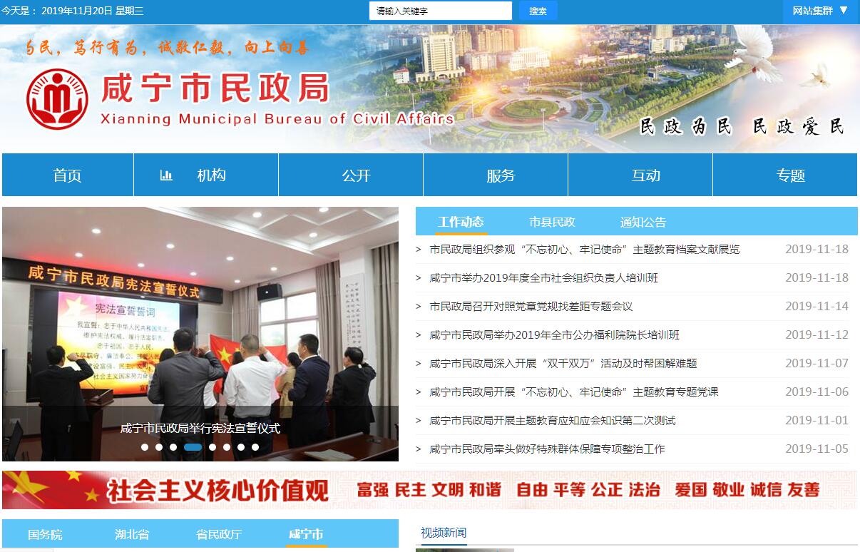 咸宁市民政局主要职责:(一)拟订全市民政事业中、长期发展规划和年度工作计划,负责民政工作方针、政策、法规的组织实施和监督检查。(二)依法对社会组织进行登记管理和执法监督。(三)拟订社会救助规划,健全城乡社会救助体系建设;负责城乡居民最低生活保障、特困人员救助供养、临时救助、生活无着流浪乞讨人员救助工作。(四)指导城乡社区治理体系和治理能力建设,提出加强和改进城乡基层政权建设的建议,推动基层民主政治建设。(五)拟订全市行政区划总体规划,负责全市行政建制的设立、撤销、更名和行政区划变更的审核报批;组织、协调和指导市内行政区域界线勘定工作;负责全市地名管理和地名公共服务体系建设。(六)拟订婚姻管理政策并组织实施,推进婚俗改革。(七)拟订殡葬管理政策、服务规范并组织实施,推进殡葬改革。(八)统筹推进、督促指导、监督管理养老服务工作,组织实施养老服务体系建设规划、政策、标准,承担老年人福利和特殊困难老年人救助工作。(九)落实残疾人权益保护政策,统筹推进残疾人福利制度建设和康复辅助器具产业发展。(十)落实儿童福利、孤弃儿童保障、儿童收养、儿童救助保护政策、标准,健全农村留守儿童关爱服务体系和困境儿童保障制度。(十一)组织促进慈善事业发展,指导社会捐助工作,负责福利管理工作。(十二)推进社会工作、志愿服务政策落实,会同有关部门推进社会工作人才队伍建设和志愿者队伍建设。(十三)负责民政福利、救助等机构领域安全生产工作。(十四)完成上级交办的其他任务。