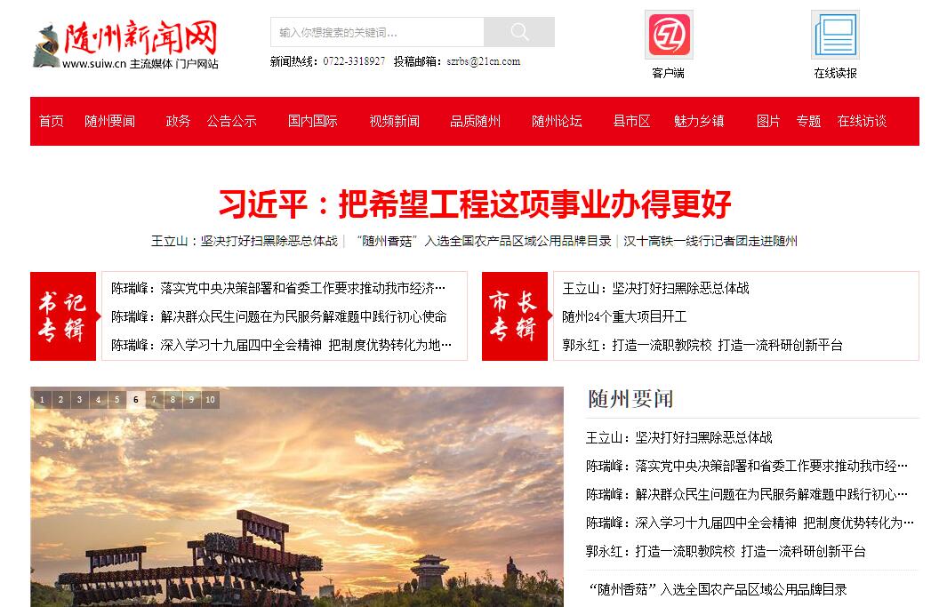 | 网站简介: 随州新闻网(www.suiw.cn)是随州地区唯一报纸《随州日报》建设的大型新闻资讯、时政、网上信息发布平台,包括随州新闻、随州(广水市、随县、曾都区、大洪山、开发区)县市区新闻。是由中共随州市委宣传部主管、随州日报社主办的以新闻、时政、资讯为主的大型综合型门户网站。 |