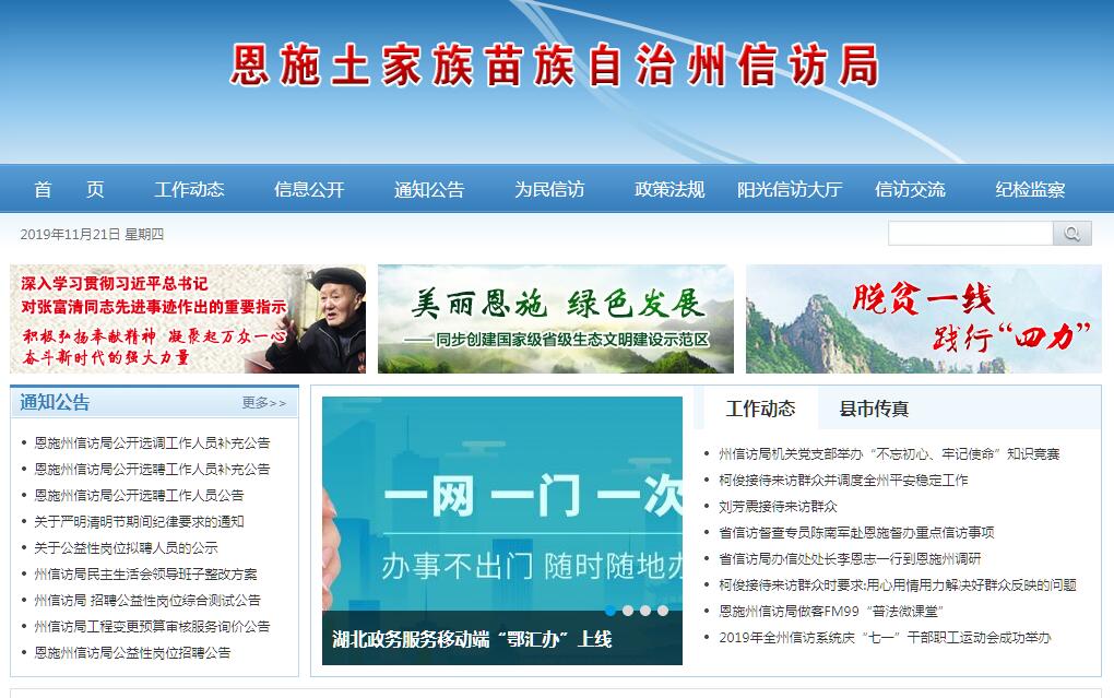 恩施州信访局于2003年9月由原来的州委、州政府信访办更名成立,2010年4月成立州委群众工作部,与州信访局合署办公,实行两块牌子,一套班子。其主要职责是:受理人民群众给州委、州政府及其领导同志的来信,接待到州委、州政府及领导同志住地和本局上访的群众,受理群众网上信访。承办上级党委、政府及部门向州委、州政府交办的来信来访事项和州委、州政府及其领导同志交办的重要信访事项;通过直接立案或交由有关地方和部门查处,督促有关地方和部门上报处理结果。向州委、州政府领导同志提供群众来信来访中的重要信息,及时反映倾向性、动态性问题和影响社会稳定的情况。综合分析人民群众来信来访情况,为州委、州政府决策当好参谋。按属地管理、分级负责的原则,向有关地方和部门转办、交办来信来访事项,并督促检查落实;对涉及几个单位或部门的信访事项,做好组织协调工作。对来信来访中反映的政策性问题进行调查研究,协助州委、州政府和有关部门研究制定有关政策措施。负责全州信访工作的综合管理。协助州委、州政府部署、检查和指导全州的信访工作,发现和解决信访问题;组织推广经验;培训信访干部,制定信访工作管理规定。贯彻落实州委、州政府信访工作领导小组对处理有关重大信访问题和指导全州信访工作的意见。深入基层,调查研究,搞好工作联系点,以点带面,推动全州信访工作的开展。搞好《信访条例》的宣传贯彻和进一步抓好群众逐级上访制度的落实。完成上级交办的其他事项。