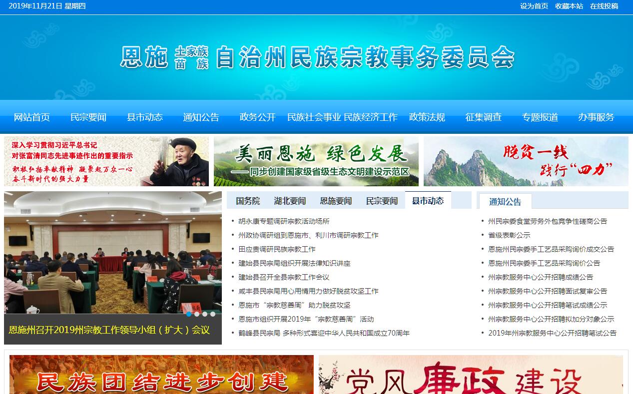 恩施州民族宗教事务委员会(规范简称:恩施州民宗委),系主管全州民族、宗教事务的政府组成部门,由州委统一战线工作部统一领导。其主要职责是:(一)贯彻执行党和国家关于民族宗教工作的方针、政策;组织开展民族宗教理论、政策和问题等重大课题的调查研究,提出相关政策性建议和意见。(二)负责协调推动全州有关部门履行民族工作相关职责,促进民族政策在经济发展和社会事业有关领域的实施,对政府系统民族工作进行业务指导。(三)负责起草全州民族宗教事务的规范性文件草案,研究拟订民族宗教工作相关政策,负责民族宗教事务工作法律法规和政策落实情况的督促检查,开展民族文化、民族教育和民族卫生、民族体育等工作。(四)承担全州少数民族古籍的搜集、整理、出版等工作。承担抢救、研究、整理、传承、利用和发展少数民族文化工作的任务。(五)研究提出协调全州民族关系的工作建议,协调处理民族关系中的重大事项,参与协调全州社会稳定工作,指导实施和完善民族区域自治制度建设,保障少数民族的合法权益,组织开展全州民族团结宣传教育和民族团结进步创建活动,承办州政府民族团结进步表彰事宜,协调组织州庆和指导全州民族乡、村的庆典活动。(六)负责拟订全州少数民族事业发展专项规划,监督检查规划实施情况,参与拟订全州经济社会相关领域的发展规划;促进建立和完善全州少数民族事业发展综合评价监测体系,推进实施民族事务服务体系和民族事务管理信息化建设。(七)研究分析全州经济和社会事业发展方面的问题并提出特殊政策建议,协调或配合有关部门处理相关事宜;协调服务全省对我州各县市和民族乡的对口支援工作。(八)会同外事主管部门负责全州宗教方面的外事归口管理工作,组织协调民族宗教工作领域有关对外和对港澳台的交流与合作,参与涉及民族宗教事务的对外宣传工作。(九)指导全州宗教团体依法依章开展活动,支持宗教团体加强自身建设,推动宗教团体在宗教界开展爱国主义、社会主义、拥护祖国统一和民族团结的自我教育,办理宗教团体需由政府解决或协调的有关事务。(十)依法履行宗教事务管理职责。依法保护公民宗教信仰自由和正常的宗教活动,维护宗教界合法权益,促进宗教关系和谐,指导全州各级政府民族宗教事务部门依法履行管理职能,处理宗教方面的重大事件,防范利用宗教进行的非法、违法活动,抵御境外利用宗教进行的渗透活动。(十一)参与拟订全州少数民族人才队伍建设规划,承担联系少数民族干部的具体工作,负责培训全州基层民族宗教工作干部,协助有关部门做好全州少数民族干部的培养、教育和使用工作。(十二)依法依规管理和审批更正少数民族成份。(十三)承办上级交办的其他事项。