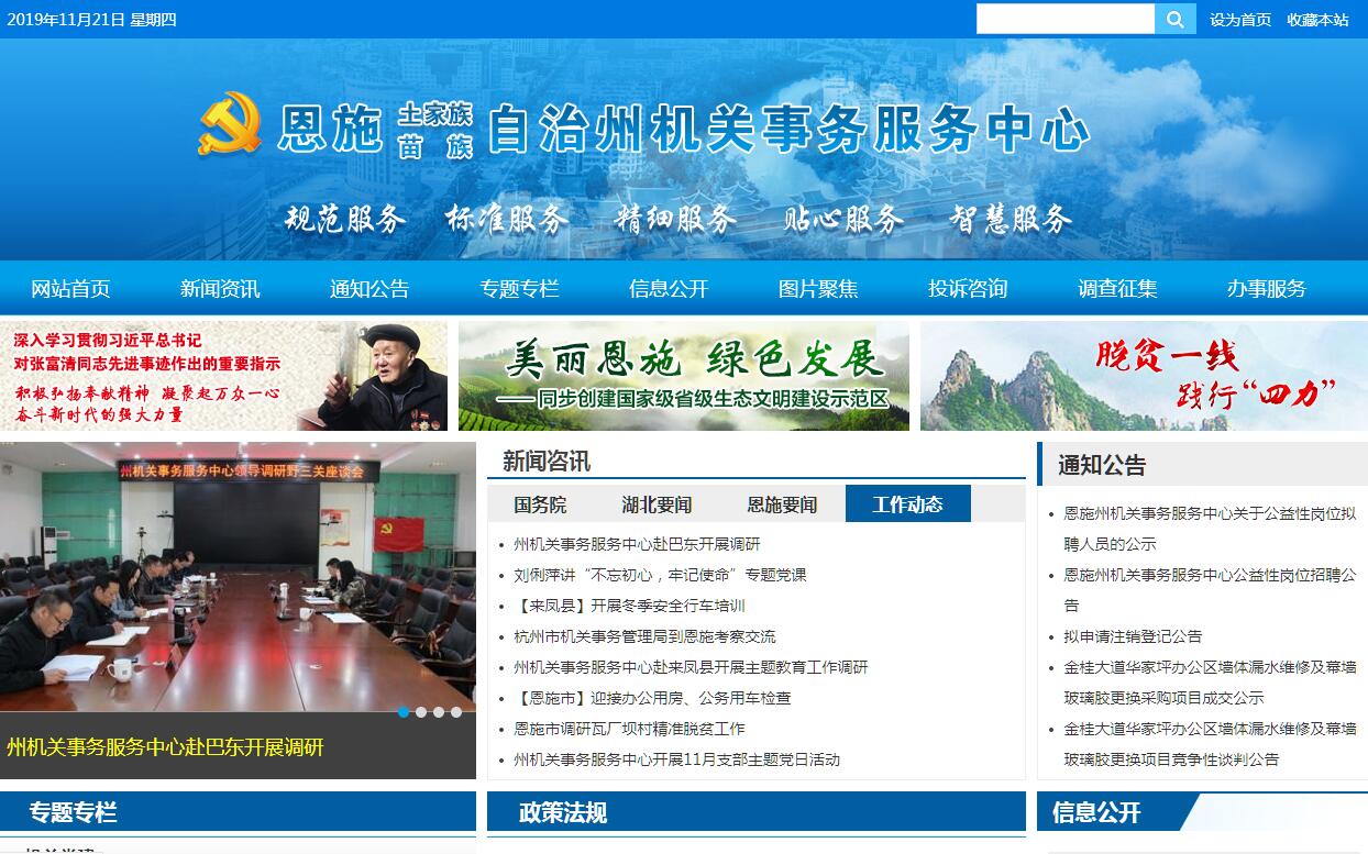 | 网站简介: 恩施土家族苗族自治州机关事务中心于2013年6月经州委、州政府同意设立,并于2013年12月20日正式挂牌开办。按照“三定”方案,我中心为州政府直属参公单位,负责管理、监督、指导全州机关事务管理工作。 |
