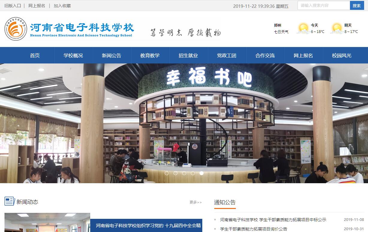 河南省电子科技学校,原名河南省纺织工业干部学校,创办于1956年,原校址在郑州市建设西路,现在的郑州市24中,占地40余亩,建筑面积7000余平方米,60年代初因中国经济困难停办。1980年复校后,经中国纺织工业部批准,为中南地区大中型企业厂长(经理)培训班河南分部,培训了河南、云南、广西等省、郑州市国有大中型纺织企业厂长(经理)。为河南省纺织行业培训各类管理干部10000余名。在河南省纺织行业中有良好的声誉。2003年隶属河南省教育厅,2006年,学校更名为河南省电子科技学校。学校性质为公办普通中等专业学校,省级文明学校、省级文明标兵学校。多年来,全校教职工以“文明、勤奋、敬业、创新”为校风,治学严谨,教学规范,管理严格,组织落实,得到了社会各界广泛的支持和信任。学校主要从事普通中等专业学历教育,开办有《网页美术设计》、《软件与信息服务》、《会计电算化》、《电子商务》、《学前教育》、《民族音乐与舞蹈》、《美术绘画》、《汽车运用与维修》、《机电技术应用》、《铁道运输管理》、《中餐烹饪与营养膳食》、《农业经济管理》、《工程造价3+2》、《建筑工程施工3+2》、《建筑装饰3+2》等专业。经河南省教育厅批准,与河南省建筑职业技术学院联合举办“3+2”大专高等职业教育。学校教学和生活设施齐全,教学成绩突出。设有汽修实训工场、学前教育实训室、烹饪专业实训室、数控编程机房、计算机房、多媒体教室、电教室、语音室、校园书吧、体育场,学生宿舍、学生澡堂等。校内使用光纤宽带上网,可同时提供学生全天候使用。河南省电子科技学校教师队伍由教授、高讲、讲师、辅导教师、实验师组成。他们中大多数既有较深的理论教学水平,又有丰富的工作经验。有多名省级优秀教师,省级学科带头人和骨干教师,省、市级师德标兵,省市、级优质课讲解获得者等。2009年,经河南省教育厅研究决定并报河南省政府同意,河南省电子科技学校承办河南省职业教育公共实训中心。该中心占地300亩,选址于郑开大道与京珠高速路东的郑州职教园区,计划3年内建成,总投资3.2亿元,其中教学实训设备投资1.25亿元,开设《现代制造技术》、《电子信息技术》、《现代汽车服务技术》、《现代物流技术》、《艺术设计与传媒》等五大专业群。未来的河南省电子科技学校,将与河南省职业教育公共实训中心为一个机构,两个牌子,一同运作。建成后河南省电子科技学校,将具有河南省最大的、最先进的职业教育公共实训基地。河南省电子科技学校办学理念: 以党的政治建设为统领,以教育教学质量为中心,依托市场设专业,把握就业明导向,素质与能力并重,就业与升学并举,培养学生综合素质全面提高,让学生健康、自信、快乐成长。河南省电子科技学校办学模式:“三坚持”、“四对接”——坚持特色办学,坚持灵活办学,坚持产教融合办学;专业建设对接市场,课程设置对接前沿,教学过程对接岗位,培养目标对接未来。2017年9月,河南省电子科技学校在郑州市二七区铁英街23号设立新校区,目前共有铁英街校区与群办路校区两个校区。