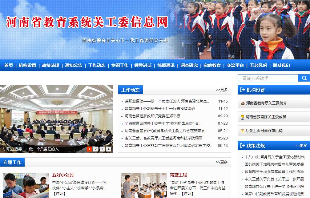 河南省教育厅关心下一代工作委员会成立于1991年6月,是以离退休老同志为主体、有在职领导参加的群众性工作机构。主要任务是组织、指导教育系统离退休老同志,配合教育部门和学校,全面贯彻党的教育方针,着力对高校和中小学校学生以及青年教职员工进行思想政治和道德品质教育,全面关心青少年健康成长,为培养德智体美全面发展的中国特色社会主义事业合格建设者和可靠接班人服务。20多年来,在教育厅党组的正确领导和大力支持下,厅关工委认真贯彻“围绕中心、配合补充,因地制宜、量力而为,立足基层、注重实效”的工作方针,团结、组织教育系统广大离退休老同志,以“忠诚敬业、关爱后代、务实创新、无私奉献”的“五老精神”,急党政之所急、想青少年所需、尽关工委之所能,作了大量开拓性工作,成为教育系统宣传贯彻社会主义核心价值观、加强青少年学生思想道德教育、关心帮助青少年健康成长的一支重要队伍。工作多次受到教育部关工委、省关工委领导的赞誉,在师生、学生家长和社会上有着广泛的影响。河南省教育厅关工委实行主任负责制,由主任主持工作,常务副主任和副主任分工协助主任工作。关工委秘书处挂靠厅离退休干部工作处,负责日常工作。关工委主任、秘书长由厅党组任命,关工委工作经费列入财政,保障支出。厅关工委全体委员会议在每年年初召开,主要总结、通报上一年工作情况,修改、通过本年度工作意见。会议一般由厅关工委主任主持,厅领导到会讲话,担任关工委委员的厅有关处室负责同志、高校和地市各协作区牵头单位关工委负责同志参加。