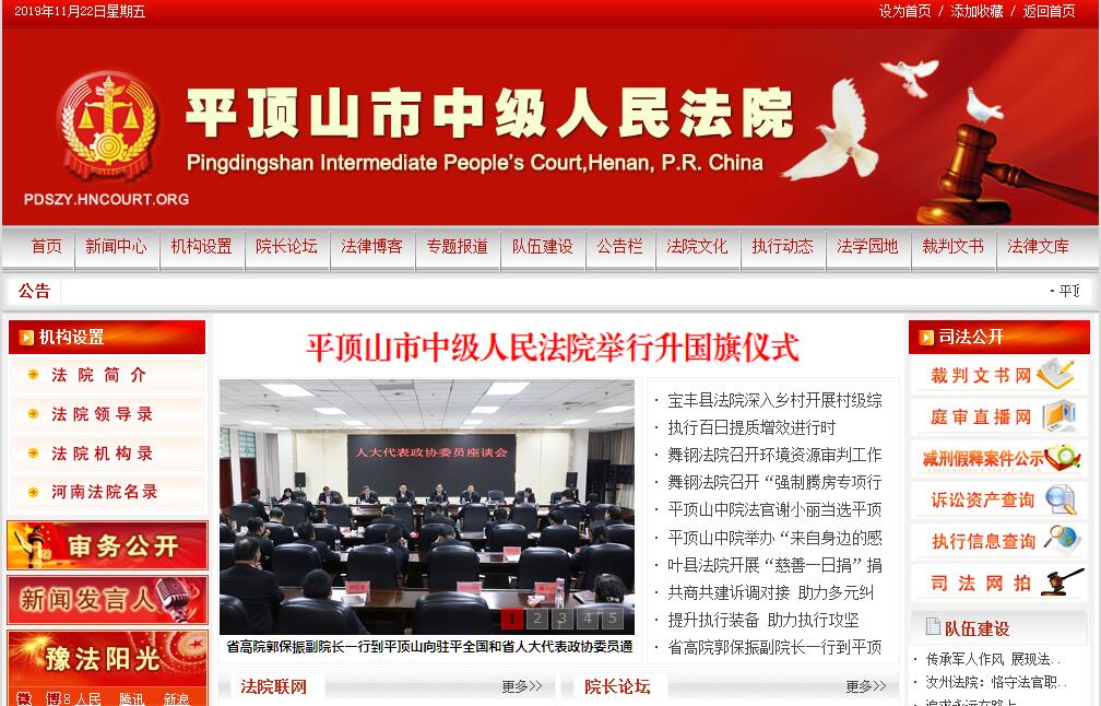 平顶山市中级人民法院成立于1973年6月,其前身是1956年成立的平顶山矿区法院。现有在职人员267人,其中,具有审判职称162人,中院党组班子成员9名,审判委员会专职委员3人。 中院内设部门25个:办公室、政治部、立案一庭、立案二庭、刑一庭、刑二庭、少审庭、民一庭、民二庭、民三庭、行政庭、赔偿办、审监庭、执行局、审判管理办公室(与绩效考核办公室合署办公)、研究室、司法技术鉴定处、司法行政装备管理处、离退休干部工作处、纪检监察室、机关党委、法警支队、河南法官进修学院平顶山分院、信息科技中心、督查联络办公室。中院新址位于市新城区长安大道与清风路交汇处,2004年12月开工建设,2007年11月16日落成启用,占地面积63亩。审判综合大楼高16层,建筑面积23000平方米,使用面积15000平方米,拥有办公室、会议室、合议室等近200间,各类审判法庭26个,其中大型审判法庭1个、中型法庭2个,小型法庭23个,还设有立案大厅、当事人接待室、侯审室、档案室、阅卷室等审判辅助功能单元,是一座融办公和审判功能为一体、有深厚的传统法律文化传承、温情的人文关怀和先进的智能化大厦,为平顶山中院的历史翻开了新的篇章。平顶山中院下辖叶县、鲁山、宝丰、郏县、汝州、舞钢、卫东、新华、湛河、石龙10 个基层法院,基层法院现有在职人员961人、 21个人民法庭。全市年均办案50000余件,平顶山中院年均办案5000余件。