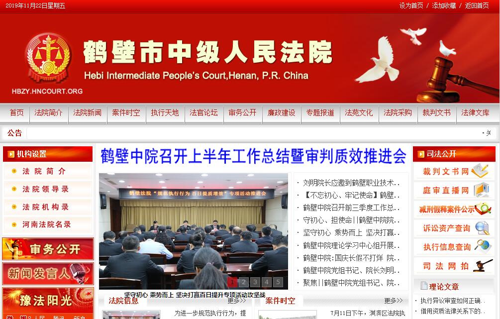 鹤壁市中级人民法院位于风景秀丽的淇水之滨,现有法官和其他工作人员123人。下辖5个基层法院,16个人民法庭。近年来,鹤壁中院在市委正确领导、省法院坚强指导、市人大有力监督,市政府、市政协及社会各界的关心支持下,以司法为民、公正司法为主线,狠抓审判执行、司法改革、队伍建设等各项工作。多项工作受到各级领导的肯定和好评,先后被最高法院表彰为“全国优秀法院”,荣获“全国民事审判工作先进集体”,两次被省法院荣记“集体二等功”,被省法院表彰为“全省先进中级法院”。在省社情民意调查中心开展的人民群众对全省18个中级法院满意度调查中,鹤壁中院保持了连续九年领跑全省中级法院,2017年再次位列全省中院第一名,五个基层法院也连年名列前茅。中院民一庭被评为“全国巾帼文明岗”,浚县法院被确定为“全国司法公开示范法院”,淇滨区法院荣获“全国法院党建工作先进集体”“一等功集体”,鹤山区法院荣获“全国法院文明示范窗口建设先进单位”。全市法院还涌现出了全国办案标兵郑月娟、齐金萍、骆慧杰,全国刑事审判工作先进个人李桂红,全国先进个人韩明文等一批先进个人。2012年以来,全市法院共有100个集体和133名个人获得省级以上荣誉。全市法院实现了队伍建设谱新曲、审判工作上台阶,干警队伍呈现出蓬勃朝气、昂扬锐气和浩然正气。努力让人民群众在每一个司法案件中感受到公平正义,是全市法院不懈奋斗的目标!面对新形势、新要求,全市法院将继续坚持司法为民、求真务实、开拓创新,忠实履行宪法和法律赋予的职责,维护公平正义,进一步提升审判质效和司法公信力,为推进鹤壁经济社会发展提供了有力的司法保障。
