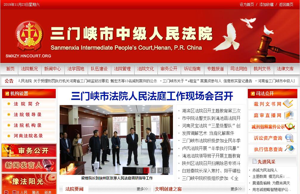 三门峡地处豫、晋、陕三省交界处,总面积10475平方公里,总人口245万。三门峡历史悠久,交通便利,资源丰富,风景秀丽。三门峡是华夏文明的发祥地之一。仰韶文化世界闻名,虢国风韵天下流芳。三门峡中流砥柱是中华民族不屈精神的象征。函古关老子著述《道德经》为人类留下了珍贵的文化瑰宝。1957年伴随着万里黄河第一坝——三门峡水利枢纽工程的建设,崛起了新兴的三门峡市。近年来每到冬天,美丽的白天鹅就飞临三门峡库区湖面上放歌起舞,吸引四方人士前来观赏,三门峡展现出一幅人与自然和谐共处的美丽画卷。三门峡市中级人民法院于1986年3月区划调整时从原洛阳地区中级人民法院分出成立。下辖湖滨区、陕州区、灵宝市、卢氏县、渑池县、义马市6个基层人民法院。三门峡市两级法院截止目前共有在编干警712人。其中中院在编干警191人,设办公室、政治部、审判管理办公室、立案第一庭、立案第二庭、刑事审判第一庭、刑事审判第二庭、未成年人案件综合审判庭、减刑假释庭、民事审判第一庭、民事审判第二庭、民事审判第三庭、民事审判第四庭、环资庭、清算与破产庭、行政审判庭、审判监督庭、执行局、研究室、司法警察支队、司法技术鉴定处、司法行政装备管理处、监察室、机关党委24个机构。三门峡中级人民法院以党的十九大精神为引领,认真贯彻市委的工作部署,坚持党对审判工作的绝对领导,以“问题”和“需求”为导向,始终坚持党的领导与司法为民相统一,始终坚持审判执行与服务大局相结合,始终坚持司法改革与工作创新相呼应,始终坚持以司法公开与外部监督相促进,加强党风廉政建设,落实“两个责任”,实施全员标准化管理,建设一支忠诚、干净、担当的法院队伍,努力让人民群众在每一个司法案件中都感受到公平正义。近年来,两级法院先后有81个集体、138名干警先后荣获国家级、省级荣誉。2017年,我们的审判质效关键指标位居全省前列,质效并进、提质增效取得重大突破,审判、执行和综合管理等各项工作获得全面进步,三门峡市中级人民法院在院党组的正确带领下,紧紧围绕“努力让人民群众在每一个司法案件中都感受到公平正义”的目标,坚持以“双创”为统领,深化质效并重工作理念,不断激发干警活力,队伍整体素质、司法能力明显提高,凝心聚力谋发展,砥砺奋进勇担当,工作作风、廉政建设明显改进,司法公信明显提升。