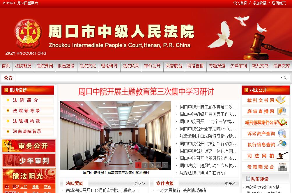 尊敬的网友,欢迎您浏览河南省周口市中级人民法院网!我院网站于2008年1月18日建成开通。八年来,我院紧紧围绕“打造优秀网络平台,铸就精品网络站点”的工作目标,积极创建动态窗口,构建交流平台,深化司法便民,较好地发挥了通过网络宣传周口、宣传周口法院、宣传周口法院干警、服务社会各界群众的作用。我院网站先后被最高法院命名为全国法院网络宣传先进单位、全国法院系统第三届“十佳网站”, 2013、2014、2015、2016、2017、2018年获全国法院网络宣传先进单位。在我院的引领带动下,10个基层法院的网站相继建成开通,形成了以点带面、点面结合的网络宣传工作格局。所有这些,得益于上级法院、兄弟法院的大力指导协助,得益于您和社会各界朋友们的大力关心支持。在此,我代表周口法院全体法官及其他工作人员表示衷心的感谢!周口市位于河南省东部,全市国土面积11959平方公里,现有人口1125.65万人,辖扶沟县、西华县、商水县、太康县、鹿邑县、郸城县、淮阳县、沈丘县、项城市、川汇区10个县市区和周口新区、周口经济开发区。周口历史悠久厚重。距今有6000多年的文明史,素有“华夏先驱,九州圣迹”之美誉。太昊伏羲氏建都宛丘(今淮阳县),定姓氏,制嫁娶,燃起了人类文明的第一缕曙光;中国女神女娲氏都于西华,抟土造人,炼石补天,被尊为中华人文始母;炎帝神农氏始都于陈(今淮阳县),尝百草,艺五谷,开创中国种植、养殖的新纪元,周口因此而成为中华文明传承史上占据重要地位的“三皇故都文化圣地”。周口古属陈国,《诗经•陈风》赫然在目;战国末期,为楚都所在地,史称郢陈;秦末农民起义,陈胜、吴广在此建立张楚政权;两汉时期,陈为皇子领地,繁荣昌盛,富甲一方;魏晋以来,以淮阳为中心历次设郡置府。周口人杰地灵,历史上名人辈出,老子(李耳)为道教鼻祖,所著《道德经》流芳千古;还有东晋太傅谢安、文学家谢灵运、现代民族英雄吉鸿昌、历史名人袁世凯等灿若星辰。我院位于周口市交通路西段,占地面积36亩,总建筑面积20000平方米,内设机构29个,在编干警217人,下辖川汇区、项城市、沈丘县、太康县、淮阳县、商水县、西华县、郸城县、鹿邑县、扶沟县10个基层人民法院。欢迎您有机会携家人、朋友来周口观光旅游,并欢迎您到周口市中级人民法院参观指导工作!2018年,全市法院在市委的正确领导下,在市人大及其常委会的有力监督下,在市政府、市政协及社会各界的关心支持下,以习近平新时代中国特色社会主义思想为指导,紧紧围绕“努力让人民群众在每一个司法案件中感受到公平正义”目标,忠实履行宪法法律赋予的职责,深入推进司法改革,持续加强队伍建设,各项工作取得新的进展。全市法院共收案123773件,结案118913件,结案率96.07%,其中市中院受理各类案件12035件,审执结11853件,结案率98.49%,全市法院审判执行质效位居全省前列。一、充分发挥审判职能,积极服务经济社会发展大局依法惩治刑事犯罪。全年共审结刑事案件9979件,判处犯罪分子12316人。严厉打击“两抢一盗”等多发性侵财犯罪,审结相关案件1291件1648人,提升人民群众安全感;审结非法集资、非法吸收公众存款、集资诈骗、电信诈骗等涉众型经济犯罪案件133件172人,维护金融秩序;审结黄赌毒犯罪案件695件855人,净化社会环境;审结非法占用农用地、盗伐滥伐林木、污染环境等破坏环境资源犯罪案件96件163人,积极服务生态文明建设;审结重大责任事故、危险驾驶等危害公共安全犯罪案件2384件2406人,保障人民群众生命财产安全;审结侵害妇女儿童权益犯罪案件166件189人,加大妇女儿童权益保护力度;审结涉未成年人案件194件281人,完善社会调查、轻罪记录封存等机制,积极开展回访帮教,保护未成年人健康成长;规范减刑、假释、暂予监外执行工作,审结相关案件1129件,不予减刑30件30人,决定收监10案10人,确保刑罚执行的严肃性。积极开展“扫黑除恶”专项斗争。两级法院严格按照中央、省委、市委关于“扫黑除恶”专项斗争工作要求,迅速行动、精心部署,全年共审结涉黑案件21件,判处犯罪分子158人;审结涉恶案件15件,判处犯罪分子149人。依法审结以贾欢欢、穆德刚、苑道功等为首的一批黑社会性质组织犯罪案件。被告人贾欢欢被依法判处死刑,缓期两年执行,剥夺政治权利终身;被告人穆德刚被依法判处有期徒刑23年;长期把持基层政权、横行乡里的苑道功等黑社会性质组织成员被依法追究刑事责任。全面深入摸排黑恶势力线索,深挖黑恶势力“保护伞”,移交涉黑线索30条,涉保护伞线索3条,营造扫黑除恶强大声势,不断推动“扫黑除恶”专项斗争向纵深发展。依法严惩贪污、受贿等职务犯罪。全年共审结贪污贿赂等职务犯罪案件120件,判处犯罪分子204人,其中厅级干部3人,处级干部9人,依法公开审理了河南牧业经济学院原党委副书记、副院长曾照烨、南阳市原副市长和学民、中国医药健康产业股份有限公司原党委书记、纪委书记、副总经理崔晓峰等一批腐败案件,促进了反腐败斗争深入开展。充分发挥民商事审判职能。全年共审结各类民商事案件60577件,标的907.03亿元。审结婚姻、继承、赡养、邻里纠纷等民事案件12441件,促进家庭和谐、邻里和睦;审结买卖、租赁、担保、房地产等案件4985件,维护市场经济秩序;积极推进“僵尸企业”破产重整,办理破产案件15件,