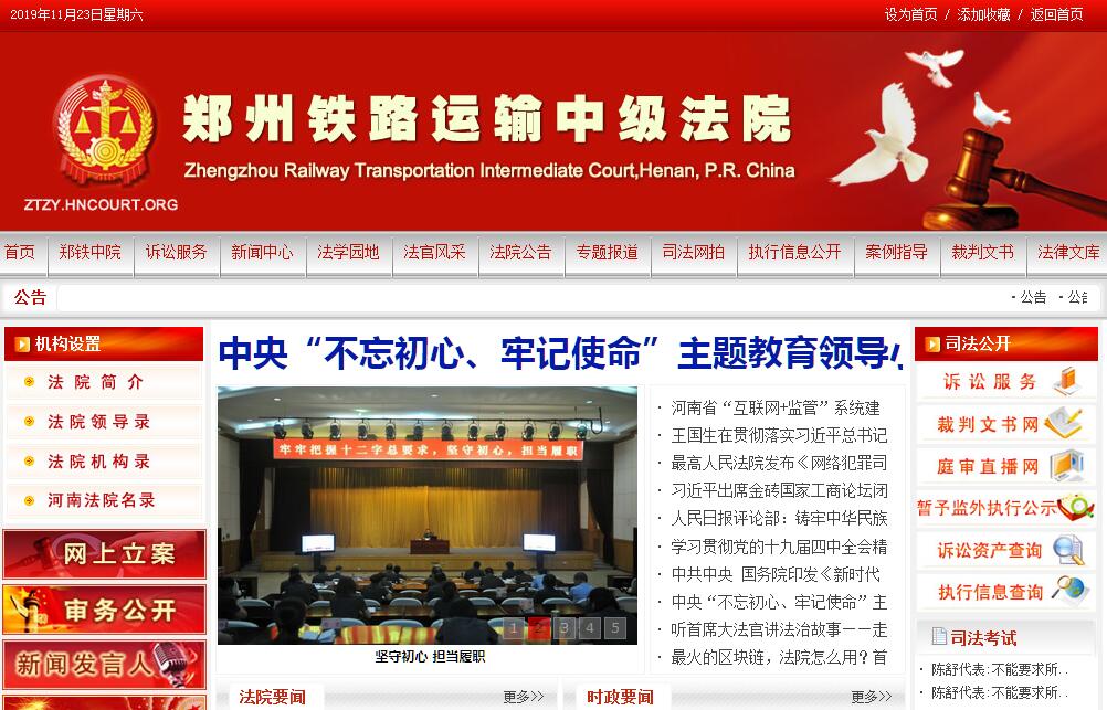 郑州铁路运输中级法院位于河南省省会郑州,是国家设立在铁路企业的专门审判机关。郑铁中院1979年恢复办案,现有法官和其他工作人员87人,90%以上人员达到本科以上文化程度,其中硕士和研究生10人,1984至2006年下辖武汉铁路运输法院、西安铁路运输法院、郑州铁路运输法院、洛阳铁路运输法院、襄樊铁路运输法院、宝鸡铁路运输法院等六个基层法院,现下辖郑州铁路运输法院和洛阳铁路运输法院2个基层法院。现任党组书记、院长王伟,党组成员、副院长李小山,党组成员、副院长王赤星,党组成员、审委会委员张爱国,党组成员、副院长姚黎辉,党组成员、纪检组组长李耀宇,党组成员、政治部主任孙喜平。郑州铁路运输两级法院自1979年恢复重建,至今已度过38个春秋。征程──两级法院从无到有、由小到大、由弱到强,伴随着我国改革前进的步伐和节奏,经历了艰难创业、艰苦奋斗、锐意进取、无私奉献的发展历程,从幼稚走向成熟,从播种走向收获,两级法院干警充分展示了自己的“亮剑”精神。历练──在河南省高级人民法院的监督指导下,全体干警艰苦创业、顽强拼搏,两级法院机构设置日趋完善,队伍素质日益提升,审判业务不断拓展,审判效能有效发挥,司法改革稳步推进,司法条件不断改善,实现了“两个文明”双丰收。耕耘──两级法院干警始终高举中国特色社会主义理论伟大旗帜,全面落实科学发展观,始终围绕党和国家的中心任务,紧密结合铁路实际,紧紧依靠人民群众,充分发挥审判职能作用,解放思想,高标定位,励精图治,团结奋斗,为铁路改革、发展、稳定提供了有力的司法保障和司法服务。辉煌──2010年郑铁中院被最高人民法院授予集体一等功,被省政法委授予“人民满意的政法单位”,被河南省高级人民法院授予集体二等功、“文化建设示范单位”、“党建工作先进单位”、“思想宣传先进单位”、“调研工作先进单位”;2011年被河南省委、省政府命名为“省级文明单位”。两级法院多次被河南省高院记集体二等功,被铁路局党委评为“四好班子”、“标杆班子”,一大批干警荣立一、二、三等功。雄关漫道真如铁,而今迈步继续越。回顾过去,我们豪情满怀;展望未来,我们憧憬无限。两级法院干警决心继续凝聚力量,振奋精神,锐意进取,携手共进,以马踏飞燕的速度和万马奔腾的气势,努力把各项工作推向一个新的水平,为建设和谐社会、和谐铁路和一流法院,做出新的更大的贡献!我们有理由坚信,两级法院的明天会更美好!