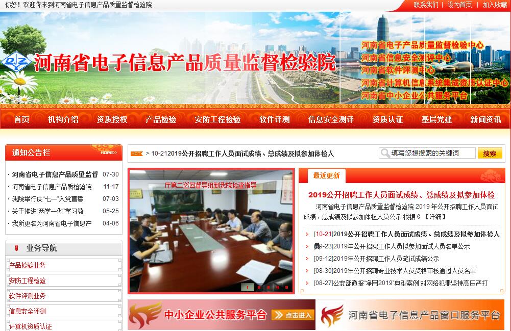 河南省电子信息产品质量监督检验院(原河南省电子产品质量监督检验所)隶属于河南省工业和信息化委员会,为全国电子产品质量监督检验系统成员单位,是专业从事电子信息产品及信息工程质量监督检验的权威机构,是具有独立法人资格和第三方公正地位的技术服务性事业单位。是河南省唯一一家电子信息产品生产许可证发放确认试验单位,是河南省唯一一家公安部授权的安全技术防范工程检测单位,是河南省质量技术监督局计量认证审查认可合格并依法授权的“河南省电子产品质量监督检验站”,是国家食品药品监督管理局授权的医疗器械检测机构,是河南省司法厅许可的司法鉴定机构,是河南省编委批准并成立的“河南省计算机信息系统集成资质认证中心”,是中国信息安全测评中心授权的国家信息安全测评中心河南测评中心,是河南省编委批准成立的河南省信息安全测评中心,是原河南省信息产业厅批准成立的省内唯一一家专业从事软件产品检测机构“河南省软件评测中心,是中国合格评定国家认可委员会认可的国家实验室。长期以来,我院在社会各界的关心支持下逐步发展壮大形成规模。目前共有技术人员70名,其中高级工程师20名,工程师36人;仪器设备600余台套,拥有产品试验室、工程检测室、软件评测室、信息安全测评室等各类试验室。确认检验、鉴定及仲裁检验工作,多次受到国家部委及省有关厅局的奖励和好评。目前,我院主要提供电子信息产品检验、信息工程检验、计算机信息系统集成资质认证、软件产品评测和信息安全测评等服务。我院愿与社会各界携手,为维护产品质量、维护市场秩序共同努力,保证各方合法权益。