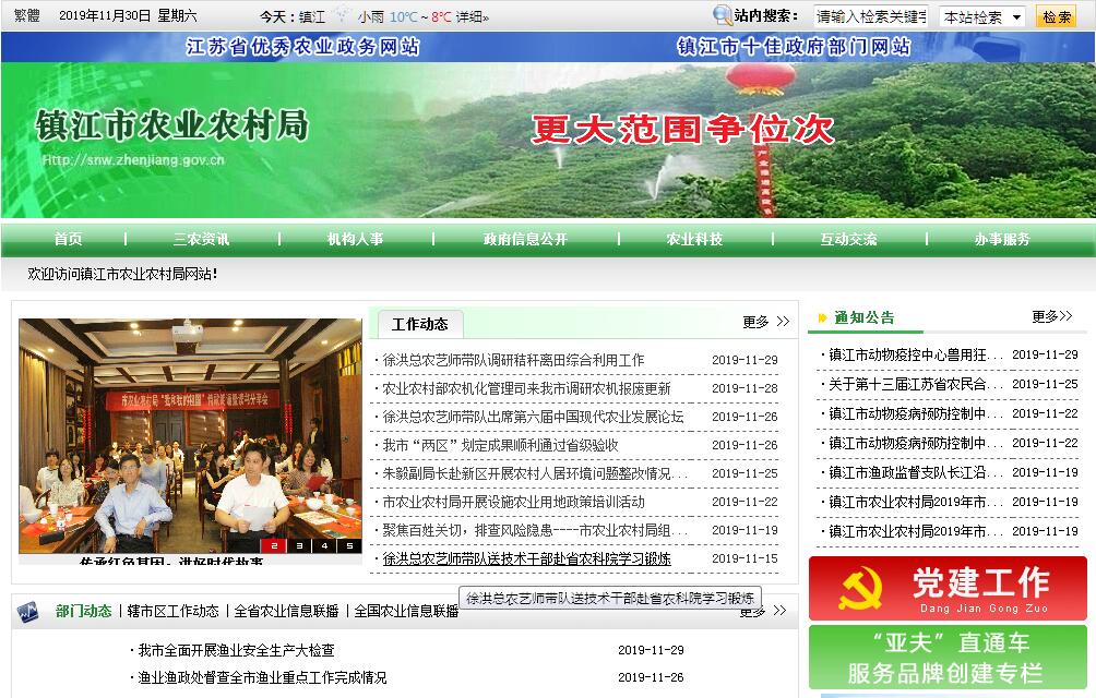 镇江市农业农村局负责贯彻落实中央关于“三农”和扶贫工作的方针政策以及省委、市委的决策部署,在履行职责过程中坚持和加强党对“三农”和扶贫工作的集中统一领导。其主要职责是:(一)贯彻落实“三农”工作发展战略,统筹研究和组织实施“三农”工作发展战略、中长期规划、重大政策。指导农业综合执法。参与涉农财税、价格、收储、金融保险、进出口等政策制定。(二)统筹推动发展农村社会事业、农村公共服务、农村文化、农村基础设施和乡村治理。牵头组织改善农村人居环境。指导农村精神文明和优秀农耕文化建设。指导农业行业安全生产工作。(三)拟订深化农村经济体制改革和巩固完善农村基本经营制度的政策。负责农民承包地、农村宅基地改革和管理有关工作。负责农村集体产权制度改革,指导农村集体经济组织发展和集体资产管理工作。指导农民合作经济组织、农业社会化服务体系、新型农业经营主体建设与发展。(四)指导乡村特色产业、农产品加工业、体闲农业发展工作。提出促进大宗农产品流通建议,培育、保护农业品牌。发布农业农村经济信息,监测分析农业农村经济运行。承担农业统计和农业农村信息化有关工作。(五)负责种植业、畜牧业、渔业、农业机械化等农业各产业工作的监督管理。指导粮食等农产品生产。组织构建现代农业产业体系、生产体系、经营体系,指导种植业、畜牧业、渔业、农机标准化生产及建设工作。负责渔政渔港监督管理,承担渔业船舶检验和监督管理责职。(六)负责农产品质量安全监督管理。组织开展农产品质量安全监测、追溯、风险评估。参与制定农产品质量安全地方标准并会同有关部门组织实施。指导农业检验检测体系建设。依法实施符合安全标准的农产品认证和监督管理。(七)组织农业资源区划工作。指导农用地、渔业水域以及农业生物物种资源的保护与管理。负责水生野生动植物保护、耕地及永久基本农田质量保护工作。推进农业绿色发展,指导农产品产地环境管理和农业清洁生产及农产品禁止生产区划定。推广休耕轮作提高耕地地力,促进农业可持续发展。指导设施农业、生态循环农业、节水农业发展以及农村能源综合开发利用、农业生物质产业发展。牵头管理外来物种。(八)负责有关农业生产资料和农业投入品的监督管理。组织协调农业生产资料市场体系建设,拟订有关农业生产资料地方标准并监督实施。制定兽药质量、兽药残留限量和残留检测方法地方标准并按规定实施。组织兽医医政、兽药药政药检工作,负责执业兽医和畜禽屠宰行业管理。依法开展农作物种子(种苗)、种畜禽、肥料、农药、兽药、饲料及饲料添加剂的相关许可与监督管理。负责重大动物疫病应急防控工作。指导和督办重大农业案件的处理。(九)负责农业防灾减灾、农作物重大病虫害防治、重大动物疫病防控工作。组织重大动植物疫病的防控工作,发布疫情并组织扑灭。指导动植物防疫检疫体系建设。组织种子、农机等救灾物资储备和调拨,提出生产救灾资金安排建议,指导紧急救灾和灾后恢复生产。(十)负责农业投资管理。提出农业投融资体制机制改革建议。编制市级投资安排的农业投资项目规划,提出农业投资规模和方向、扶持农业农村发展财政项目的建议,按照规定权限审批农业投资项目,负责农业投资项目资金安排和监督管理。组织实施中央和省投资安排的农业投资项目。 (十一)推动农业科技体制改革和农业科技创新体系建设。指导农业产业技术体系和农技推广体系建设,组织开展农业领域的高新技术和应用技术研究、科技成果转化和技术推广。负责农业转基因生物安全监督管理和农业植物新品种保护。(十二)指导农业农村人才工作。拟订农业农村人才队伍建设规划并组织实施,指导农业教育和农业职业技能开发,指导新型职业农民培育、农业科技人才培养和农村实用人才培训工作。(十三)承办农业涉外事务工作,组织开展农业对外交流、农业利用外资、农业“走出去”、农业贸易促进和有关国际经济技术交流合作,指导开放型农业发展,协助实施农业援外项目。(十四)贯彻落实扶贫工作方针政策和法律法规,研究拟订全市扶贫工作规划、专项规划和年度计划。协调拟订财政专项扶贫资金的分配、使用方案。建立健全扶贫开发协调机制,统筹推进专项扶贫、行业扶贫和社会扶贫。配合做好扶贫工作队的组建、管理。推进落实精准扶贫精准脱贫工作长效机制,探索缓解相对贫困的有效路径。建立健全扶贫工作责任制,制定和落实扶贫开发目标责任和考核评价办法。负责脱贫攻坚工作考核,组织第三方评估,实施绩效考核评价。负责全市扶贫开发宣传、培训和信息化建设等工作。(十五)完成市委、市政府交办的其他任务。