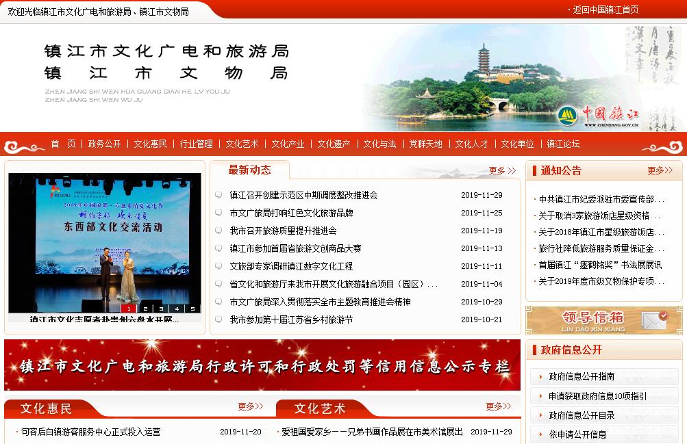镇江市文化广电和旅游局(简称文广旅局)是市政府工作部门,加挂市文物局牌子,于2019年1月在原镇江市文广新局和原镇江市旅游委的基础上组建而成,对应省文化和旅游厅、省广电局和省文物局等三个省级部门。主要职能包括:贯彻执行国家和省关于文化、广电、旅游和文物工作的方阵政策和法律法规,拟订相关实施政策;负责指导、管理、协调全市文化事业、文物事业、广播电视事业、文化产业、旅游业发展等。目前,市文广旅局内设18个处室;下属11个事业单位,分别是镇江市文化市场综合执法支队、镇江博物馆、镇江市文化馆(镇江市艺术中心)、镇江市图书馆、茅山新四军纪念馆、镇江民间文化艺术馆、镇江画院(镇江市美术馆)、焦山碑刻博物馆、镇江市艺术创作研究中心、镇江市文化系统会计结算中心和镇江市旅游培训中心。其主要职责是:(一)研究拟订全市文化、广电、旅游和文物政策措施,起草历史文化保护方面地方性法规、规章草案。(二)统筹规划全市文化事业、广播电视事业、文化产业、旅游业发展,拟订发展规划并组织实施,推进文化和旅游融合发展,推进文化广电和旅游体制机制改革。(三)指导、管理全市文艺辜业,指导艺术创作生产,扶持体现社会主义核心价值观、具有导向性代表性示范性的文艺作品,推动各门类艺术、各艺术品种发展。(四)负责全市公共文化事业发展,推进全市公共文化服务体系和旅游公共服务建设,深入实施文化和旅游惠民工程,统筹推进基本公共文化服务标准化、均等化。(五)指导、推进全市文化和旅游科技创新发展,推进文化和旅游行业信息化、标准化建设,推进智慧旅游发展。(六)负责全市非物质文化遗产保护,推动非物质文化遗产的保护、传承、普及、弘扬和振兴。(七)负责对全市各类广播电视机构进行业务指导和行业监管,会同有关部门对网络视听节目服务机构进行管理。实施依法设定的行政许可。(八)指导全市电视剧行业发展和电视剧创作生产。监督管理、审查广播电视节目、网络视听节目的内容和质量。指导监管广播电视广告播放,组织实施广播电视节目评价工作。(九)组织实施全市广播电视公共服务重大公益工程和公益活动,指导、监督广播电视重点基础设施建设,扶助欠发达地区广播电视建设和发展。协调、推动广播电视领域产业发展,负责推进广播电视与新媒体新技术新业态融合发展,推进广电网与电信网、互联网三网融合。负责对广播电视节目传输覆盖、监测和安全播出的监管,指导、推进全市应急广播体系建设。(十)指导、推进全市文物事业发展,组织文物资源调查,指导、协调文物保护利用工作,组织、指导文物考古工作,负贵全市博物馆监督管理工作。(十一)指导、管理全市性重大文化、广播电视、旅游活动,指导市级重。点文化设施建设,组织全市旅游整体形象推广和品牌建设,促进文化产业、广电产业、旅游产业市场推广和对外合作,制定全市旅游市场开发战略并组织实施,指导、推进全域旅游。(十二)指导全市文化和旅游市场发展,对文化和旅游市场经营、服务质量进行行业监管,推进文化和旅游行业信用体系建设,依法规范文化和旅游市场。(十三)指导全市文化旅游市场综合执法,组织协调查处全市性、跨区域的文化、文物、出版、广播电视、电影、旅游等市场的违法行为,督查督办大案要案,维护市场秩序。(十四)组织实施全市文化和旅游资源普查、挖掘、保护和利用工作,促进文化产业和旅游产业发展。(十五)负责全市风景名胜区行业管理和监督;配合做好园林城市创建工作;负责金山焦山北固山国家风景名胜区景区范围内、南山省级风景名胜区景区范围内的有关行政审批、行政执法工作。受相关部门委托,在金山焦山北固山和南山风景区范围内行使城市管理、市场监管、交通运输、体育、文化等行政执法权。(十六)负责全市文化、广播电视、旅游、文物领域安全及应急综合协调和监督管理;监管 A 级以上旅游景区、风景名胜区、旅游度假区、旅游星级饭店和旅行社的安全生产。(十七)指导、管理全市文化和旅游对外及对港澳台交流、合作和宣传、推广工作,组织大型文化和旅游对外及对港澳台交流活动。(十八)完成市委、市政府交办的其他任务。