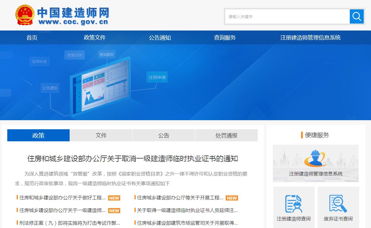 | 网站简介: 中国建造师网是住房和城乡建设部执业资格注册中心主办的全国建造师统一管理的网站。中国建造师网为了加强建设工程项目管理,提高工程项目总承包及施工管理专业技术人员素质,规范施工管理行为,保证工程质量和施工安全而创办。中国建造师网向社会发布建造师相关的法律法规 、动态信息、公告通知、考试大纲、成绩查询等竭诚为建造师提供信息服务。 |