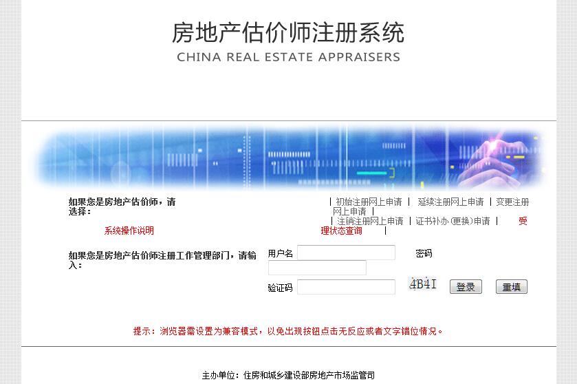 | 网站简介: 房地产估价师注册管理系统由住房和城乡建设部房地产市场监管司主办。 |
