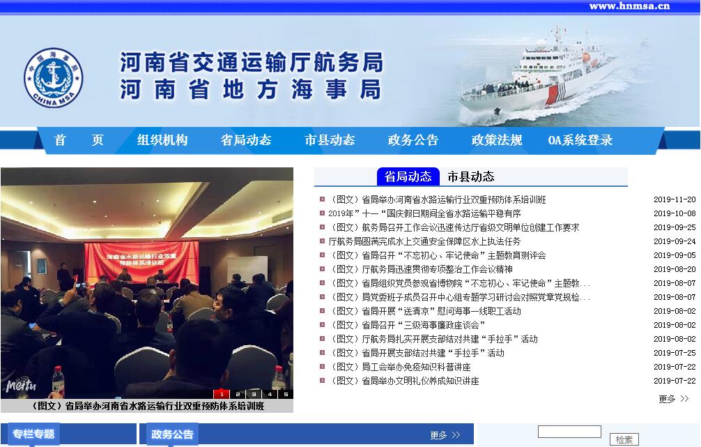 | 网站简介: 2000年6月,经省编委批准,成立河南省交通厅航务局(挂河南省地方海事局牌子)。2009年9月,经省编办同意,更名为河南省交通运输厅航务局(挂河南省地方海事局牌子)。河南省交通运输厅航务局(河南省地方海事局)隶属于省交通运输厅,主要负责全省水路交通基础设施建设、水路运输、船舶检验及水上交通安全的管理工作。 |