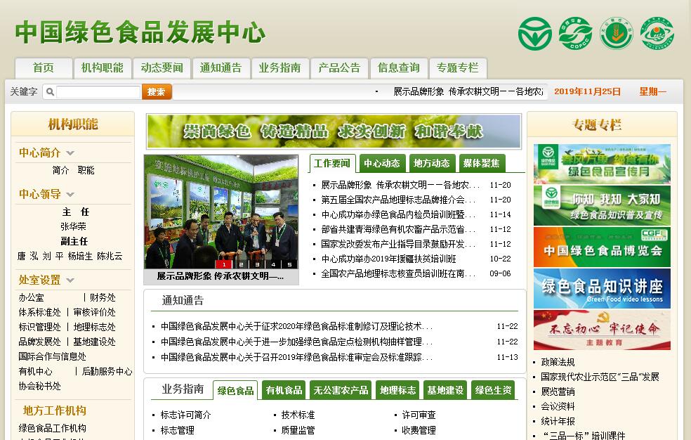 中国绿色食品发展中心成立于1992年,是负责绿色食品标志许可、有机农产品认证、农产品地理标志登记保护、协调指导地方无公害农产品认证工作的“三品一标”专门机构,同时负责农产品品质规格、营养功能评价鉴定,协调指导名优农产品品牌培育、认定和推广等工作。中心为隶属于农业农村部的正局级事业单位,与农业农村部绿色食品管理办公室合署办公。内设:办公室、财务处、体系标准处、审核评价处、标识管理处、地理标志处、品牌发展处、基地建设处、国际合作与信息处、中绿华夏有机食品认证中心等10个处室和部门。中国绿色食品协会秘书处和优质农产品开发服务协会秘书处挂靠中心,中心内部还设有北京中绿田源农业发展有限公司和后勤服务中心。其主要职责是:1.参与绿色食品、有机农产品和地理标志农产品发展有关规章制度、规划计划、政策措施的拟订及实施。2.负责绿色食品、有机农产品认证及农产品地理标志登记审查。3.承担绿色食品、有机农产品标志授权管理和产品质量跟踪检查的具体工作。4.参与拟订绿色食品、有机农产品和地理标志农产品相关质量标准、技术规范并组织实施,开展有关国际交流与技术合作。5.开展绿色食品、有机农产品和地理标志农产品生产基地创建、技术推广和宣传培训,承办农产品品牌培育、市场发展和展示推介等工作。6.组织实施绿色食品、有机农产品和农产品地理标志登记相关检验检测工作。7.组织开展农产品品质规格、营养功能评价鉴定等相关工作。8.协调指导名优农产品品牌培育、认定和推广等工作。9.协调指导地方无公害农产品认证相关工作。10.承担农业农村部交办的其他工作。