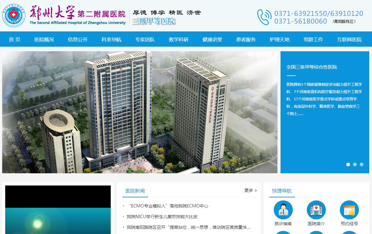 郑州大学第二附属医院创建于1952年,是一所学科设置齐全、技术力量雄厚、医疗设备先进的三级甲等综合医院,是河南省首批博士生培养点和博士后流动站,是医学人才培养的重要摇篮和基地之一。医院为全年“无假日医院”,是国家药物临床试验机构;河南省医保、河南省新农村合作医疗、河南省大病救助、河南省异地就医、河南省直干部保健及郑州市医保等定点医疗机构。医院位于郑州市中心位置,现有经八路综合院区、南阳路郑州大学眼耳鼻喉医院院区和郑州国际物流园区门诊部。位于郑州国际物流园区占地426亩的一个现代化、规模化、综合化的新院区正在加紧筹备中。开放床位2000张,职工2600余人,享受国务院特殊津贴专家、河南省优秀专家10余名,有包括河南省特聘教授、郑州大学特聘教授在内的教授、副教授300余人,博士生导师、硕士生导师140多人。医院所有临床专业均为硕士生培养点,内科、外科、妇产科、神经内科等学科为博士培养点。医院具有明显的临床特色。重症医学入选国家疑难病症诊治能力提升工程;有泌尿外科学、精准医学、脑血管病学三个院士工作站。重症医学、心血管学、神经病学、内分泌病学、老年医学、呼吸病学、妇产科学入选河南省直机构医疗服务能力提升工程;产科学、生殖医学、妇科学、脑血管病学、神经病学、泌尿外科学、心血管外科学、重症肌无力、胸外科学、心电诊断学、心血管病学、消化病学、麻醉学、护理管理学、专科护理学等15个学科被河南省卫计委评为河南省医学重点学科;康复医学、肿瘤治疗学被评为河南省医学重点培育学科;脑血管病转化医学为河南省重点实验室,重点学科的数量在全省省级综合性医院中排名第三。胸外科、妇科、产科、神经外科、脑血管病、肿瘤内科、心血管内科、麻醉疼痛、内分泌、呼吸内科十个专业入选国家药物临床试验机构资格认定。重症医学、生殖医学、微创医学和介入治疗等均居省内领先水平。医院开展的多项医疗技术在省内、甚至国内独具优势,如无痛胃镜和无痛肠镜诊疗技术,电子宫腔镜和3D电子腹腔镜治疗妇科疾病,重症监护ECMO技术,消化内镜隧道技术切除肿瘤,微创手术治疗食管癌、颅脑疾病,心脏不停跳冠脉搭桥,心脏和肿瘤的介入治疗,非体外循环下全胸腹主动脉置换技术,主动脉夹层诊治技术,产科的无保护接生技术,手术治疗重症肌无力和癫痫,等离子汽化电切治疗前列腺疾病,输尿管软镜技术治疗泌尿系结石,产瘫的手术治疗,心血管康复体外反搏治疗,脊柱外科、人工髋膝关节置换,FFR指导下的支架置入技术,气道硅酮支架植入,纤维支气管镜和胸腔镜诊治肺部疾病,超声乳化治疗白内障等。医院拥有雄厚的科研及教学实力。是国家全科医生临床培养基地、国家卫计委临床药理实验研究基地、全国首批四级妇科内镜手术培训基地、中国初级创伤救治国家级培训基地、中国食管心脏电生理技术中心,中国残联康复人才培养基地等,并当选为中国临床营养联盟副秘书长单位、中国妇产科联盟常务理事单位等。设有河南省卫生厅肝病防治重点实验室、河南省子宫颈癌防治中心、河南省泌尿系结石诊治中心、河南省高血压研究会以及郑州大学消化疾病、胸腔疾病、脑血管病、神经疾病、神经生物学、医学微生态学、医学生物工程、泌尿外科等科研诊疗研究所。一些在省内甚至国内颇有影响的医学期刊,如国家级《中国实用神经疾病杂志》、省级《胃肠病学和肝病学杂志》、《河南外科学杂志》以及SCIE期刊——《生命科学学报》(系郑州大学学报海外版)等编辑部均设在我院。是我省内为数不多的获准开展辅助生殖技术的医疗单位。医院拥有一批在国内和省内先进的诊疗设备。如世界先进的256排新双源CT、3.0T核磁共振系统(MRI),国内先进的数字减影血管造影机(DSA)、四维彩超、“290”电子胃镜、心脏中心监护系统、人工肝、肝肿瘤射频治疗系统、无痛胃镜、无痛肠镜、电子宫腔镜、3D电子腹腔镜和电子胸腔镜、TCT、LEEP刀、体外震动排石机(我院研发获国家专利)、体内超声气压弹道碎石机、当前世界先进的电子输尿管软镜、经直肠前列腺超声定位多点穿刺仪、全飞秒准分子激光治疗仪、全自动生化分析仪等。医院国际、国内学术交流活跃。经常同美、英、德、日等国家和港、澳、台地区进行广泛的学术交流与合作,多次成功举办了国家级和省级不同医学领域的大型学术活动。在社会各界的广泛关注和大力支持下,医院坚持“以病人为中心”的办院宗旨和“厚德 博学 精医 济世”的医院院训,以“特色突出 国内知名”为愿景,加快改革步伐,实行科学管理,注重行风教育,开展优质服务,积极引进国内外新技术、新项目,不断增强服务能力和水平,取得了丰硕的成果。近年来,医院先后获得全国“群众满意的卫生计生机构”、全国优质服务示范医院、全国卫生系统先进集体、全国医改创新奖、全国优质服务岗、河南省医改创新示范医院等荣誉称号,得到了社会各界的广泛认可与高度评价。