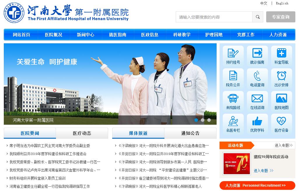 河南大学第一附属医院始建于1949年,兴居八朝都会开封市,2000年并入河南大学,成为河南大学第一附属医院,六十多年的风雨兼程,六十多年的健康发展,现已成为一所集医疗、教学、科研、预防、康复和急救为一体的省直综合性三级医院。是国家首批全科医师规范化培训基地、国家住院医师规范化培训基地、教育部卓越医生教育培训计划基地、国家卫计委脑卒中定点监测医院、国家糖尿病早期检测开封分中心、卫计委国际紧急救援中心网络医院、国家卫计委内镜与微创培训基地、省政府指定的人身伤害医学重新鉴定医院、河南大学司法鉴定中心、河南省高血压控制研究中心开封分中心,省市新型农村合作医疗、开封市医疗保险、城镇居民医疗保险等定点医院。目前,医院开放床位1600余张,职工1700余人,教授、副高级以上职称、博士300余人,享受国务院特殊津贴1人,河南省政府特殊津贴1人,河南省科技特聘学科带头人1人,河南省青年科技后备人才8人,黄河学者3人,70余人分别担任国家级、省、市级专业学会主委、委员。近年来,医院不断加强国内交流,建立了培训基地,定期选派科室骨干外出进行学术交流和技术培训,为学科发展提供坚实保障。细化规范学科门类,是开封市(豫东地区)专业设置最为齐全的综合性医院。医疗技术精湛,60年代在省内外率先开展了结肠代食管术、70年代开展芫花引产技术、80年代开展前列腺气化电切术、90年代开展脑立体定向技术治疗帕金森病等。目前开展的复杂心脏病手术治疗、心脑血管病介入治疗、多学科微创治疗、肿瘤适型调强治疗、肿瘤个体化治疗等已达到省内领先、国内先进水平,成为豫东唯一品牌。拥有肿瘤学、神经病学、心血管外科学、消化病学、医学影像学等10个省医学重点学科,普通外科学、神经外科学等3个重点培育学科;口腔医学、临床医学2个省教育厅重点学科;医院拥有河南省神经疾病国际联合实验室、河南省医学肿瘤分子免疫重点实验室、开封市分子影像与肿瘤分子免疫重点实验室、河南大学肿瘤中心、河南大学神经疾病研究所等9个科研机构。拥有省级、校级、市级、院级科技创新团队6个;设有院内青年创新基金,近年来医院科研立项总数达180余项,国家自然基金项目获批20项,其中国家自然科学基金国际合作重点项目填补了河南省卫生系统临床医学类该项目的空白。医院是河南省培养高级医疗卫生人才的教学基地,是临床医学一级学科专业型及学术型硕士学位授权单位,涵盖20个二级学科,承担河南大学医药护技本、硕教学任务,研究生导师100余人。拥有国家级“卓越医生教育培养计划”项目1项,国家级大学生创新创业实验项目3项,省级教改项目3项。 医院拥有美国GE750宝石能谱CT、美国GE750 3.0T磁共振、德国西门子数字减影血管造影机(DSA)、高清超声内镜等一大批先进的医疗设备,SPECT-CT、PET-CT,PET-MR的投入使用,成为同时拥有PET-CT、PET-MRI的单位,与院基因诊断中心结合,实现了诊断手段从影像学向分子学的跨越。医院信息化建设智能化,紧跟时代发展,将“流程再造”成为医院信息化建设的核心,转变经营战略改进服务模式,最终实现病人的更满意。医院为省级文明单位标兵,先后荣获 “全国百姓放心医院”、中华全国总工会授予“全国模范职工之家”;中华全国总工会教科文卫体工会授予“抗震救灾,重建家园工人先锋号”;国家卫计委授予“志愿服务在医院活动先进单位”;河南省五一劳动奖状,河南省卫计委授予“河南省健康促进示范性医院”、“河南省群众满意医院”、“医政管理先进单位” 、“优质护理服务先进单位” 、“行风建设先进单位”、“健康中原先锋岗”、“新农合先进单位”、“信息化管理先进单位”、“医院创新管理先进单位”、“卫生文化建设先进单位”、河南省高校工委授予“先进基层党组织”等多项荣誉。在《开封市医疗卫生资源区域规划(2009)》和河南省卫计委、河南省发展与改革委员会《郑汴新区区域卫生发展与资源配置规划(2010)》中,我院在开封市新区河南大学校园旁另有规划占地360余亩的新院区,启动一院两地建设规划,新院区一期工程建成时新增床位500张,建筑面积29万平方米,集医疗、教学、科研、预防、保健、康复和急救为一体的,功能齐全、技术先进、环境优美的高水平大学附属医院和区域性重大疑难病症防治研究中心。届时,我院总占地面积达500余亩,总建筑面积40万平方米,开放床位达到2500张规模。