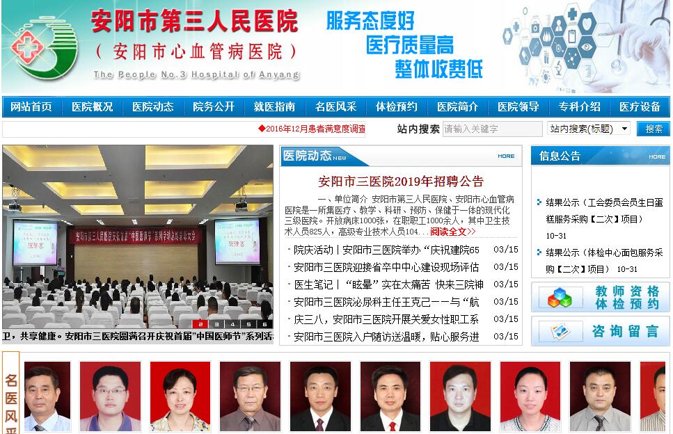 安阳市第三人民医院、安阳市心血管病医院是一所集医疗、教学、科研、预防、保健于一体的现代化三级医院,是国家科技支撑计划“心血管诊疗监测基地”,系郑州大学第一附属医院临床教学协作医院、郑州大学第一附属医院网络会诊中心安阳分中心,系河南省首批“新农合参保儿童重大疾病救治定点医院”、系“安阳市心血管病工程技术研究中心”、“安阳市城镇职工基本医疗定点医院”、“安阳市新型农村合作医疗城市定点医院”、“安阳市城镇居民基本医疗定点医院”“安阳市农村居民重大疾病市级定点救治医院”。医院秉承“一切以病人为中心,让病人及亲友满意”的办院宗旨,坚持“服务态度好、医疗质量高、整体收费低”办院方针。开放病床1500张,年门诊量20多万人次,年收治病人2万多人次。医院设一站四个中心和临床医技科室50余个及20个病区。一站即:急救站,四个中心即:安阳市心血管病工程技术研究中心、安阳市健康体检服务中心、安阳市小儿脑瘫疗育中心、郑州大学第一附属医院网络会诊中心安阳分中心。该院心内科、微创骨科、神经内科被确定为安阳市重点专科,泌尿外科绿激光治疗前列腺增生被确定为安阳市重点专病;心胸外科、脑外科、妇产科、内分泌科、皮肤科、体检服务中心等专科在市内外享有良好声誉。2016年11月26日,市三医院新建门诊病房综合楼投入使用。市三医院新建门诊病房综合楼是安阳市十大民生工程之一,地上22层,地下1层,建筑面积32000平方米,建设项目包括:门诊部、住院部、手术部、重症医学科、血液净化中心、中西药房、检验中心、信息中心、会议中心等。新增床位750张,该大楼的投入使用,及大地改善了医疗条件和住院环境,惠及广大患者。医院拥有200多台(套)大中型现代化的诊疗仪器设备。主要有:美国GE3.0T核磁共振仪、德国西门子双源CT、德国西门子螺旋CT、飞利浦CV20数字平板大型C臂、德国尤斯特拉体外循环机、德国德尔格麻醉机、主动脉球囊反搏治疗仪、多导电生理记录仪、射频消融治疗仪、心电遥测监护系统、飞利浦IU22高端智能彩超、美国GE VV7多维星彩超、美国GE四维彩超、德国西门子全数字彩超、美国GE便携式床旁彩超、美国GE全数字DR拍片机、西门子数字胃肠机、移动X光机、日本奥林巴斯全自动生化分析仪、美国贝克曼AU2700全自动生化分析仪、美国贝克曼化学发光免疫分析仪、法国梅里埃荧光免疫分析仪、德国BE全自动血凝分析仪、日本全自动五分类血球计数仪、西斯美康全自动尿沉渣分析仪、全自动细菌监测系统、美国meterpius荧光免疫分析仪、全自动液基细胞制片成像系统、美国史塞克腹腔镜、关节镜、日本电子胃镜、电子肠镜、美国微创椎间盘镜、美国新一代大功率绿激光手术系统、美国前列腺汽化电切镜、经皮肾镜、气压弹道碎石机、多功能体外碎石机、纤维支气管镜、日本奥林巴斯宫腔镜、德国菲森优斯血透机(双泵)、日本尼普洛血透机、日本床旁血液连续滤过装置、大型高压氧仓、意大利柯时迈肺功能测试仪、日本欧姆龙动脉硬化检测仪、脑电地型图仪、动态脑电图仪、视频脑电图仪、神经诱发电位仪、无痛分娩仪、产后康复治疗仪、多功能麻醉机、纽邦360呼吸机、小儿呼吸机、徕卡M525手术显微镜、高频电刀、手术动力系统、黄疸测定仪、德国产皮肤病治疗仪、集中供氧负压吸引系统等。医院十分重视人才培养和技术进步及创新。近年来,开展了主动脉弓置换+象鼻手术、冠状动脉搭桥手术、法乐四联症根治术、重症联合瓣膜置换术、心脏生物瓣膜置换术、心脏瓣膜成形术、主动脉瓣环+瓣膜置换术、右室双出口根治术、心内膜垫缺损根治术、心脏粘液瘤切除术、主动脉夹层瘤支架植入、房间隔缺损修补、室间隔缺损修术、室缺单项活瓣修补术、肺动脉瓣交界切开成形术、冠脉造影、球囊扩张、支架植入、冠脉内血栓抽吸、单腔双腔起搏器植入、射频消融、脑出血微创治疗、脑动脉瘤栓塞、颅内外动静脉狭窄支架植入、脑动脉畸形栓塞、颈内动脉支架植入术、烟雾病手术治疗、颅内宽颈动脉瘤栓塞术、椎动脉血管内支架成形术、人工关节置换术、关节融合术,骨水泥强化椎弓根螺钉固定治疗骨析疏松性压缩骨析,经皮椎体成形术、盘状半月板成形术、交叉韧带重建等微创手术,胸椎病理性骨折椎体成形术,多发椎管内硬膜下肿瘤切除术、胸腰椎骨折微创椎弓根钉固定术等高难度手术以及腹腔镜、关节镜、宫腔镜、宫腔镜腹腔镜联合手术以及肝胆和周围血管的介入治疗等先进技术项目130多项。医院在优质服务与医院管理上不断创新。采取了“亲情助患免费服务”、“基础护理日”、“天天问卷调查”、“患者知情权调查”、“无假日医院”、“三优一满意”、“全面实施精细化管理、深入开展优质服务”、新农合患者直补、新农合参保儿童先心病手术及白血病治疗免费等一系列优质服务措施,受到了广大患者的一致好评。荣获了“全国巾帼文明岗”、“河南省卫生系统先进集体”、“十一五省卫生系统行风建设先进单位”、“三优一满意活动先进单位”、“医院管理年活动优秀单位”、“市消费者信得过单位标兵”、“省爱国卫生先进单位”、“省消费者信得过单位”、“省行风建设先进单位”、“市文明单位标兵