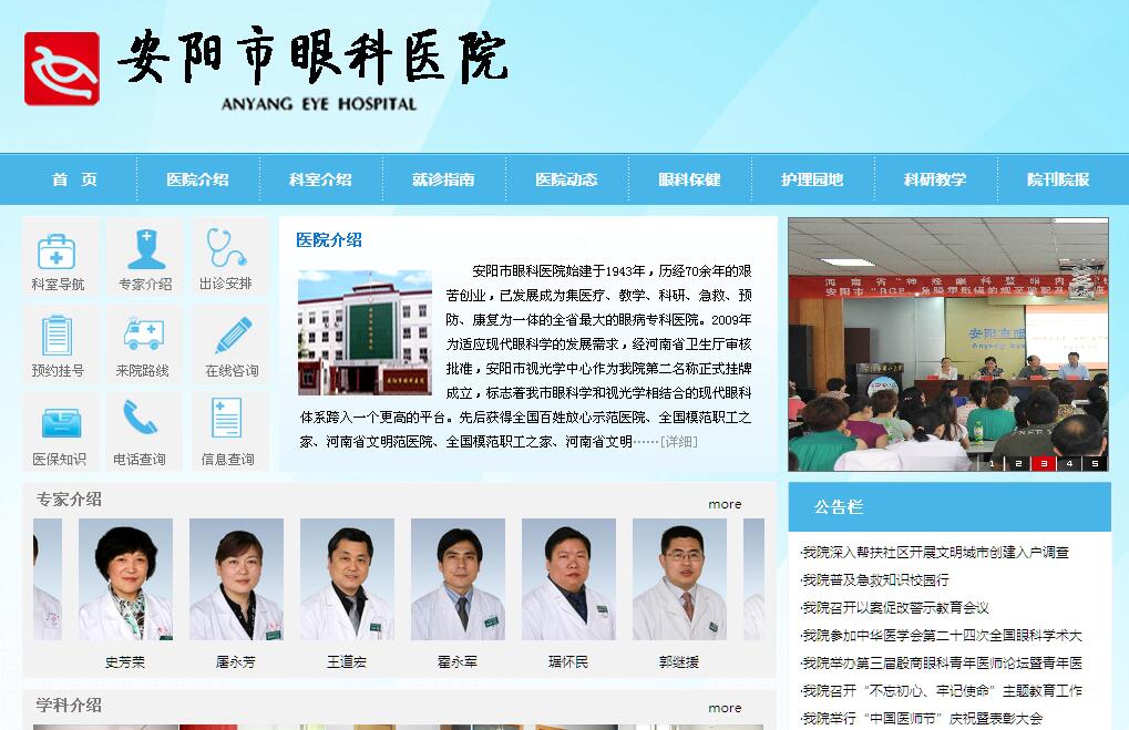 安阳市眼科医院始建于1943年,历经70余年的艰苦创业,已发展成为集医疗、教学、科研、急救、预防、康复为一体的眼病专科医院。2009年为适应现代眼科学的发展需求,经河南省卫生厅审核批准,安阳市视光学中心作为我院第二名称正式挂牌成立,标致着我市眼科学和视光学相结合的现代眼科体系跨入一个更高的平台。医院先后获得全国百姓放心示范医院、全国模范职工之家、河南省文明单位、河南省医学临床特色专科、河南省眼科网络分中心、首都医科大学眼科学院临床科研教学基地、河南省节水型单位等称号。医院目前现有职工268名,编制床位210张,专业技术人员197人,高级职称42人(市管专家3人)。临床学科设有角膜病、青光眼、白内障、眼外伤、眼底病、眼部整形、眼肌病、眼眶病、中医眼科、防盲治盲学组和相关眼科实验室、医技检查室及安阳市眼库等。视光学中心下设视光学门诊、准分子激光治疗中心、医学验光配镜中心、斜弱视及小儿眼科、近视弱视训练中心、青少年眼健康体检站等科室。拥有国际先进的大型眼科医疗设备50余台,整体医疗设施居全省前列。对照2010年卫生部颁发的《三级眼科医院基本标准(征求意见稿)》,我院目前整体实力已经达标,并在许多领域具备了突出的专科优势。近年来,医院把人才培养作为一个系统工程来抓,多策并举,已培养出一批医德医风高尚、理论功底深厚、临床技术精湛的优秀人才队伍。同时医院把准分子激光、玻璃体切割、屈光性白内障手术、眼底激光、近视弱视治疗、显微眼部整形、青光眼早期诊断及治疗等技术做为攻关重点项目,所开展的准分子激光治疗近视手术、复杂性玻璃体视网膜手术、白内障超声乳化术、角膜移植术、非穿透性小粱切除术、青光眼房水引流物植入术、眼眶肿瘤手术、眼部整形美容术、复杂性眼外伤眼内重建术和真菌性角膜炎病源学检查等诊治项目均已达到国内先进水平。科研方面与首都医科大学眼科学院联合承担了“十五”、“十一五”、“973”科技攻关项目,与北京大学眼科中心合作开展了国际糖尿病眼病防盲项目和与郑大一附院眼科合作开展安阳市“1530工程”项目等,加快了与国际先进技术的接轨。优秀的专业技术队伍,高精尖的医疗设备,高科技的诊疗方法,高水平的管理团队和高质量的人本服务,整洁优美的就医环境,安阳市眼科医院、安阳市视光学中心的所有医务人员随时为广大眼病患者排忧解难、普撒光明,为人民健康保驾护航。
