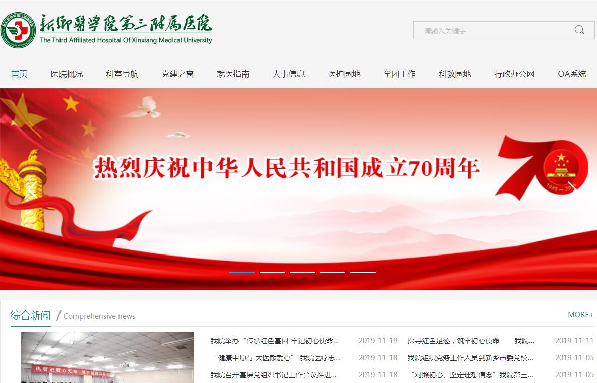 新乡医学院第三附属医院始建于1983年,是一所集医疗、教学、科研、预防、康复为一体的省直属三级综合性大学附属医院,是河南省按病种付费试点医院,是城镇职工医保、城镇居民医保、新型农村合作医疗定点医院,也是多家保险机构定点医院。医院风景秀丽、环境优美、设施完备、服务贴心,是广大患者朋友诊疗康复的理想场所,现占地面积12万平方米,医疗用房已达到9万平方米,开设床位1200张,规划床位2000张。近年来,医院实现了跨越式发展,经济效益和社会效益显著提高,赢得了社会各界的广泛认可和赞誉,相继荣获“全国百姓放心示范医院”“全国医院感染横断面调查先进单位”“河南省卫生系统先进集体”“河南省群众满意医院”“”“河南省卫生计生对外开放工作先进单位”“河南省卫生计生安全生产先进单位”“河南省卫生科技管理工作先进集体”“河南省卫生计生宣传工作先进集体”“河南省资产管理先进单位”“三好一满意活动先进单位””“河南省创新医院”“健康中原先锋岗”“新乡市文明单位”“新乡市平安医院”“新乡市青年文明号”等荣誉称号。医院地理位置:坐落于巍巍太行山下、滔滔黄河之滨的牧野文化历史名城新乡市,位于城市新城区中心华兰大道东段。毗邻京港澳高速公路和新乡火车东站,北临新乡市政府、新乡市军分区和几所高校,人口密集,交通十分便利。医院技术力量:现有在职职工1600余名;卫生专业技术人员1300余名,其中高级职称人员200余名,博士、硕士学位人员300余名。医院重视人才队伍建设,多方引进人才,并重视现有人才的培养。医院学科设置:开设有内科(心血管、神经、呼吸、消化、肾病、血液、内分泌、风湿免疫、肿瘤)、外科(颅脑、骨科、脊柱、肝胆、胃肠、心胸、泌尿、小儿、手足、微创)、妇产科(妇科、产科、生殖医学)、儿科(呼吸、消化、血液、肾病、新生儿病)、感染性疾病科、急诊科、眼科、耳鼻喉科、口腔科、皮肤性病科、医疗美容科、中医科、针灸理疗康复科以及麻醉科、手术室、放射科、功能检查科、病理科、超声医学科、检验科、输血科等50余个临床、医技科室和近30个临床教研室及实验室。同时,医院另开设有健康体检管理中心、司法鉴定中心和法医门诊,不断拓宽服务渠道,完善服务内容,方便患者的诊疗康复和人民群众的健康管理、咨询。医院专业特色:眼科学为河南省重点学科,肿瘤病理学为河南省医学重点学科,妇科学、眼科学、内分泌学、口腔解剖生理学为河南省医学重点培育学科,泌尿外科、妇科科为卫生部内镜与微创医学培训基地,麻醉科为卫生部舒适化医疗研究基地,肿瘤内科为卫生部癌痛规范化治疗示范病房培育单位,肿瘤内科为河南省癌痛规范化治疗示范病房,生殖医学科获批开展辅助生殖技术(试管婴儿)单位,人工授精实验室、肿瘤转化医学实验室为新乡市重点实验室,艾滋病筛查实验室为新乡市优秀实验室,口腔医学科为新乡市获批开展口腔种植技术单位,病理学为新乡市国际远程病理会诊基地。我院为全国宁养医疗服务计划成员单位,由香港李嘉诚先生倡导和资助的宁养院是河南省内一家临终关怀机构,免费上门服务,为晚期贫困癌症患者提供镇痛治疗、心理疏导、护理指导和生命伦理照顾;此外,为充分发挥眼科优势,扩大服务范围,造福周边群众,医院在新乡市健康路2号(人民公园西门)设立了眼科医院,方便了市区患者就诊咨询。医院医疗设备:拥有3.0T磁共振、128层螺旋CT、DSA、大型X光机、彩色多普勒超声诊断仪、全高清腹腔镜、宫腔镜、关节镜、准分子激光治疗仪、超声乳化仪、OCT、直线加速器、体外震波碎石机、全自动生化分析仪等。医院服务水平:坚持 “以人为本”、“以病人为中心”“病人无过错”的服务理念,实行门诊弹性工作制和无假日门诊,设置特殊患者专用服务窗口;设立门诊综合服务台,提供全方位的便民服务;成立客户服务中心,配备专职病区助理,围绕住院病人深入开展各项人性化服务;提供病历复印、邮寄服务,网上预约和现场预约诊疗服务;深入开展“优质护理服务工程”,不断创新护理服务模式,充实护理服务内涵,持续提高护理服务水平。多年来,医院努力打造服务品牌,真正实现了服务全天候、无缝隙,真正做到了困难有人帮、看病有人引、检查有人陪、入院有人迎、出院有人送,充分展示了医院良好的精神风貌,有效提升了医院的品牌影响力。医院勇于承担社会责任:不断强化医院公益性质,打造惠民工程,关注、改善民生。与电视台合作常年播出“新乡健康大讲堂”栏目,向社会传播健康理念、普及防病知识、倡导卫生习惯、弘扬文明新风。新乡医学院第三附属医院在创新在成长,在未来的发展道路上,在医院党委的正确领导下,全院干部职工将进一步解放思想、深化改革、抢抓机遇、求实创新,坚持“质量立院、服务兴院、技术强院”的发展理念,坚定不移的推进管理改革、技术改革和服务改革,统筹兼顾并正确处理好“速度与质量、规模与效益、当前发展与持续发展、快速发展与科学发展”等各方面关系,快速形成“院有重点、科有特色、人有专长”的发展格局,为把三附院建成新乡市的医疗救护基地、保健康复基地、健康宣教基地以及弘扬人类大爱的基地而继续努力奋斗。