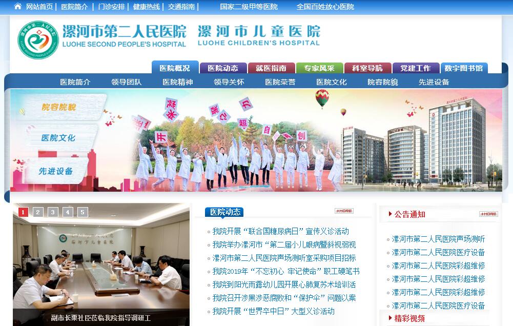 漯河市第二人民医院始建于1956年,是一所集医疗、科研、教学、预防、康复为一体的国家城市二级甲等医院。根据漯河市区域卫生规划,2011年1月经河南省卫生厅批准,加挂漯河市儿童医院牌子。医院是河南省人民医院协作医院,郑大一附院、郑大三附院、郑大五附院、郑州市儿童医院合作单位,2015年5月加入“北京儿童医院集团、郑州市儿童医院医疗联合体”,2016年4月,成立漯河市儿童急救中心,5月31日,漯河市急救中心正式挂牌成立!至2016年8月,建筑面积58376平方米的新门诊、病房楼建成并投入使用,总建筑面积达75000平方米,彻底改变了医院的面貌和基本条件,一个环境优美、设施齐全、功能完善的现代化综合医院展现在人们面前。医院现有在职职工近800人,其中高级职称83人,中级职称190人;有40个临床医技科室,18个病区,可开放床位995张。医院现有市级以上重点专科和特色专科9个,其中显微手足外科、儿科为河南省医学重点培育学科、市医学重点专科;肝胆外科、妇产科为市医学重点专科,神经内科、皮肤科、口腔科为市医学特色专科;中医针灸科、小儿康复科为市中医类重点专科。医院拥有飞利浦128层螺旋CT、飞利浦1.5T磁共振、美国产多排螺旋CT、西门子血管造影系统(DSA)、飞利浦双板DR、德国史托斯牌电视腹腔镜、德国费森尤斯血液透析机、数字胃肠机、瑞士哈美顿呼吸机、飞利浦四维彩色超声仪、新生儿听力筛查仪、听觉诱发电位仪、射频消融治疗仪等国际先进大型医疗设备200多台(件); 成功开展了断肢再植、皮瓣转移、髋关节膝关节置换、腹主动脉瘤切除、人造血管移植、肾上腺嗜铬细胞瘤切除、肝肿瘤半肝切除、腹腔镜各种手术、单卵低体重四胞胎的成功救治等一大批填补漯河市空白、省内领先的新技术、新项目,近年来共发表论文500余篇,其中核心期刊100余篇,出版专著20余部,获省、市科研成果100余项。医院先后荣获全国民主管理先进单位、全国十佳百姓放心医院、河南省医院管理年活动综合评价先进单位、河南省卫生先进单位、市文明单位等多项荣誉。多次被评为市新农合、市医保管理先进单位等。医院计划通过5年的努力,加快人才队伍建设,加强重点专科的建设,完善多元化医疗服务模式,将医院建设成为管理规范、布局合理、设施完善、功能齐全、技术精湛、服务优良的现代化医院,发展成为综合型的三级甲等医院,打造漯河市儿童医院名片,成为豫中南地区具有领先水平的区域性医疗卫生中心,更好地为全市及周边地区人民群众提供健康服务。