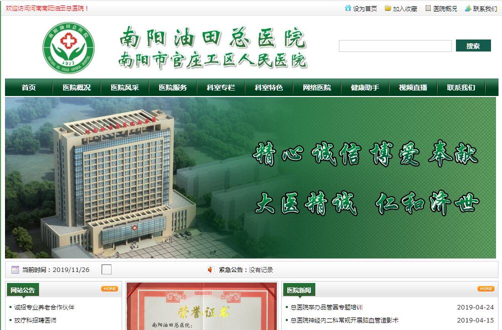 河南石油勘探局职工医院(南阳市官庄工区人民医院)始建于1972年,现已发展成为集医疗、教学、科研、康复、保健为一体的国家三级综合医院。服务范围已从油田区域辐射到周边两省六县(区),1996年被卫生部和世界卫生组织评审为“爱婴医院”。近年来,相继成为“河南省城镇职工基本医疗保险定点医疗单位”、南阳市市直职工和城镇居民医疗保险、新型农村合作医疗城市定点医院、官庄工区新型农村合作医疗定点医院、郑州大学、新乡医学院、南阳医专教学实习医院、南阳市120急救网络医院、河南省医疗机构医学检验、医学影像、病理检查结果互认医院。设有解放军总医院(301医院)远程医疗系统。同时又是“中国糖尿病综合防治计划定点推广单位”、河南省人民医院、郑州大学第一附属医院、省胸科医院等医院协作单位、油区法医鉴定中心等。医院先后被评为河南省卫生先进单位、南阳市卫生系统先进单位、南阳市消费者信得过单位等称号。医院曾被评为河南省、南阳市“三好一满意”活动等先进单位,河南省卫生系统构建和谐医患关系工作先进单位,被省卫生厅综合评价为A级医院。全院现有职工911名,拥有专业技术人员857人,其中:主任医师19人、副主任医师68人、中级职称268人。医院核定床位600张。设置有20多个临床科室和近10个医技科室。拥有双源CT、双排CT、直线加速器、核磁共振、全数字四维多功能彩超、C型臂心血管造影机、DR高端X线数字成像系统、腹腔镜、Leep环切电刀、三U白内障超声乳化仪、电子胃镜、全自动生化分析仪、EX-2100全自动血液分析仪、UF100全自动尿沉渣分析仪、体外冲击波碎石机、前列腺电切镜、宫腔镜等先进医疗设备300余台套。全院年均收治病人20000余人次,门诊工作量51万余人次,急诊抢救病人3000人次,大中型手术3200余例,且主要医疗技术指标保持较高水平。医院坚持以人才为根本,以技术为主体,以专科为特色的科技兴院发展战略,相继建成了消化道内镜介入、腔镜诊疗、脑血管病诊疗、高血压病诊疗、糖尿病诊疗、肝病诊疗、血液净化、远程医疗、疼痛诊疗、乳腺病诊疗等医疗特色,并有心内科、普外科、神经内科、感染科、内分泌科、妇产科、耳鼻喉科、骨科、儿科和呼吸内科被批准为河南省、南阳市重点、特色专科,医疗服务质量持续提高。