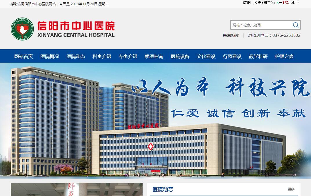 信阳市中心医院创建于1920年,1998年更名为信阳市中心医院,是一所集医疗、急救、科研、教学、预防、保健、康复为一体的三级甲等综合医院。医院总占地面积5.2万平方米,建筑面积9.8万平方米,编制床位1500张,实际开放床位1762余张,年门(急)诊114万人次,年出院病人7.36万多人次,年住院患者手术人数2万余例。医院拟计划总投资20亿元,总建筑面积25.2万平方米,设置病床1800张,按现代化“三级甲等医院”标准建设的新院区正在建设之中,将于2019年底投入使用。医院现有在岗职工2723人,专业技术人员2304人,其中高级职称344人,医学博士、医学硕士研究生391人,享受政府津贴5人,信阳市专业技术拔尖人才8人,有40多名专家在省、市医学会担任主任或副主任委员职务。医院设施设备先进,拥有Elekat synergy(医科达)直线加速器、飞利浦3.0T核磁共振全身扫描仪、西门子1.5T核磁共振、飞利浦256排螺旋CT、西门子64排螺旋CT、美国GE经济型PET-CT、SPECT、直线加速器、血管造影机、电子胃镜、关节镜等1000余台(件)国际大型医疗设备,为临床提供科学、准确的诊断依据。医院共设56个临床、医技科室,设有国家住院医师规范化培训基地、国家高级卒中中心、中华医学会临床药学分会临床药师培训中心、中华医学会疼痛学分会临床培训医院、中华医学会“华佗工程—腹膜透析置管手术规范化项目实践培训基地”、省级胸痛中心、省级创伤中心、信阳市高危孕产妇救治中心、信阳市危重新生儿救治中心等。疼痛科为省级医学临床特色专科,泌尿外科、内分泌科、急诊科、心血管科为市级重点专科。近年来,相继开展急性缺血性脑梗死静脉溶栓介入取栓技术、急诊PCI、心脏不停跳冠脉搭桥术、经尿道输尿管软镜钬激光碎石术、内窥镜下逆行胰-胆管造影(ERCP)、脑动脉瘤夹闭术、胸腔镜下食管癌根治术、惠普尔氏术(根治性胰十二指肠切除术)、植骨术在重度牙周病治疗中的应用、以及各种微创、介入、无痛诊疗技术,系列内窥镜诊疗等100多项新技术填补了信阳市医疗技术空白,部分诊疗技术达到省级先进水平。先后获得国家级、省级科研项目10余项,每年获省、市科学技术进步奖10余项,每年在国家级核心期刊、省级期刊发表学术论文400余篇。医院与国家、省级医院建立医疗联盟,组建了“信阳市中心医院医疗集团”,现有23家成员单位。实施智慧医疗、分级诊疗、双向转诊和预约诊疗服务,将门诊60%号源作为预约挂号号源管理,现有微信、手机APP等6种预约诊疗方式。医院始终坚持“以人为本,科技兴院”的院训,秉承“仁爱、诚信、创新、奉献”的医院精神,持续改善服务态度、提高服务质量、美化服务环境、优化服务流程,落实惠民政策,使医院逐步成为百姓放心、群众满意的品牌医院。医院先后荣获“全国模范职工之家”、“河南省文明单位”、“河南省卫生先进单位”、“河南省卫生系统先进集体”等几十项荣誉称号。与时俱进树大医风范,诚信惠民献仁慈爱心。信阳市中心医院党委坚持以团结、干事、创业、廉洁、高效的工作作风,带领全院职工满载灿烂的精神文明之花,丰硕的物质文明之果,紧紧围绕“深化改革、以人为本、科技兴院、谋求发展、再铸辉煌”的发展思路,向着“管理科学,服务优质,技术先进,设备精良,质量一流,环境优雅”的大型现代化三级甲等综合医院的目标阔步前进!