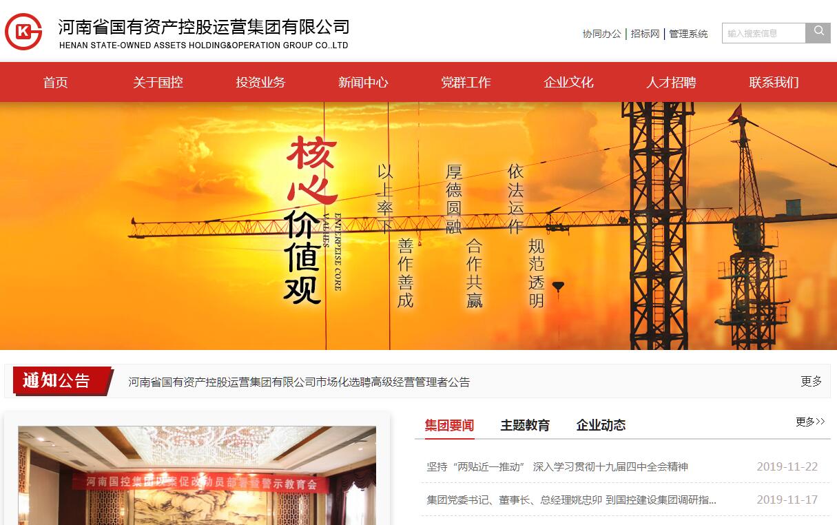 河南省国有资产控股运营集团有限公司(以下简称河南国控集团)是根据省政府《关于推进地方政府投融资体系建设的指导意见》和《关于加快推进省直机关所属企业脱钩改制工作的实施意见》的精神,经河南省人民政府批准并出资设立的国有独资公司,省政府国资委受河南省人民政府委托,履行出资人职责。河南国控集团于2009年12月25日注册成立,注册资本10亿元,下属全资、控股及参股二级子企业13家,在岗职工约7000人。河南国控集团作为省级综合性资产经营公司,具有企业重组、债务处置、股权管理三大职能。近年来,在省委省政府、省政府国资委的正确领导和关心支持下,认真贯彻落实各项决策部署,通过“四资”运作,积极发挥国资重组、投融资、不良债务处置及股权管理等功能,按照省政府安排完成了国有企业脱钩改制工作、重大项目投资和资产重组等任务,资产集聚效果初步显现,资产规模不断扩大,国资监管水平不断提高,综合实力不断增强。面对当前复杂经济形势,国控集团主动适应经济新常态,积极谋划“十三五”规划,初步考虑,按鼎形定位、鼎形战略和鼎形布局思路运作,将集团定位为战略管控中心、投资决策中心、人力资源配置中心、资源资本资金管理中心、控股企业风险监督中心,成员企业定位为资产管理中心、利润中心、战略实施主体,理顺体制,计划用3-5年时间将国控集团打造成为资产质量较优、流动性较强、企业运转高效、管理规范透明的现代化集团公司,更好地服务于我省国企改革,为加快中原崛起河南振兴富民强省做出新的更大贡献。