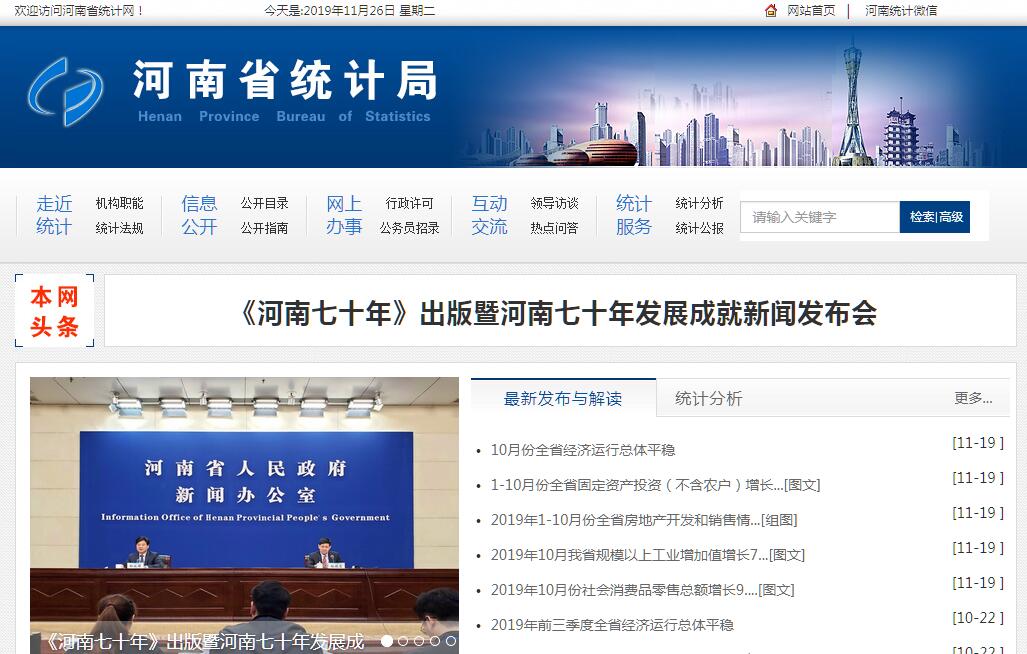 河南省统计局贯彻落实党中央关于统计工作的方针政策和决策部署,在履行职责过程中坚持和加强党对统计工作的集中统一领导。其主要职责是:(一)组织领导和协调指导全省统计工作,确保统计数据真实准确、及时;贯彻执行国家统计政策、规划、基本统计制度和统计标准,制定我省统计制度和统计标准;贯彻执行国家统计法律、法规及规章,拟订统计地方性法规、规章草案,制定部门规范性文件;负责基本单位名录库建设和维护管理。(二)负责拟订统计行政执法相关政策标准,负责重大案件查处,组织协调跨区域执法工作,负责提出统计违纪违法责任人处分处理建议,承担法律法规赋予省级统计行政部门履行的其他执法职责,监督指导市县统计行政执法工作。(三)贯彻执行国家国民经济核算制度,拟订全省国民经济核算制度,建立健全全省国民经济核算体系和统计指标体系,配合国家统计局核算全省生产总值,组织核算各省辖市、直管县(市)生产总值,监督管理各省辖市、直管县(市)国民经济核算工作。(四)会同有关部门贯彻落实全国重大国情国力普查计划、方案,组织实施全省人口、劳动工资、经济、农业等国情国力普查和投入产出调查等大型专项调查,汇总、整理和提供有关国情国力方面的统计数据。(五)组织实施农林牧渔业、工业、建筑业、批发和零售业、住宿和餐饮业、房地产业、装卸搬运和仓储业、互联网和相关服务、软件和信息技术服务业、租赁和商务服务业、居民服务、修理和其他服务业、文化体育和娱乐业等统计调查,组织实施能源、投资、人口、劳动工资、科技、企业创新、文化产业、社会发展基本情况、环境基本状况等统计调查,收集、汇总、整理和提供有关调查的统计数据;综合整理和提供地质勘查、资源、房屋、对外贸易、对外经济、交通运输、邮政、信息传输、财政金融税收、旅游、教育、卫生、社会保障、公用事业等全省性基本统计数据。(六)组织实施规模以下工业抽样调查、规模以下工业企业成本费用调查、建筑业小微企业抽样调查、小微企业固定资产投资情况调查、规模以下企业创新调查、限额以下批发零售住宿餐饮行业抽样与问卷调查、规模以下服务业抽样调查,开展调查情况分析研究;组织实施重要统计监测评价考核和社情民意调查。(七)组织各省辖市、直管县 (市)及省政府各部门的经济、社会、科技和资源环境统计调查;统一核定、管理、公布全省性基本统计资料,定期发布全省国民经济和社会发展情况的统计信息。(八)对国民经济、社会发展、科技进步和资源环境等情况进行统计分析、统计预测和统计监督,向省委、省政府及有关部门提供统计信息和咨询建议。(九)审批省级部门统计标准,依法审批或备案省级各部门统计调查项目、地方统计调查项目;指导专业统计基础工作、统计基层业务基础建设;组织建立全省服务业统计信息共享制度和发布制度;建立健全统计数据质量审核、监控和评估制度,开展对重要统计数据的审核、监控和评估;依法监督管理涉外调查活动。(十)协助省辖市管理统计局局长;指导全省统计专业技术队伍建设;监督管理各省辖市、直管县 (市)政府统计部门由中央财政、省财政提供的统计经费和专项基本建设投资。(十一)建立并管理全省统计信息自动化系统和统计数据库系统,组织制定各省辖市、直管县(市)及省政府各部门统计数据库和网络的基本标准和运行规则;指导省辖市、直管县(市)统计信息自动化系统建设。(十二)领导和管理设在省辖市、县 (市、区)的直属调查机构。(十三)完成省委、省政府交办的其他任务。